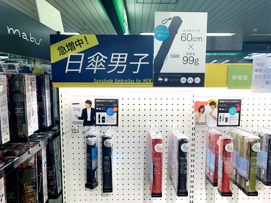 觀念改變也需要有切合需求的商品推波助瀾。近年來,以男性為目標消費者的陽傘也逐漸增加,除了在功能性強調「晴雨兩用」之外,傘的支架也會相較女性取向的商品要更長,設計面則以符合上班族形象的簡潔俐落為主,以增加男性使用者的接受度,同時也將日常小物進化成更時尚的配件。