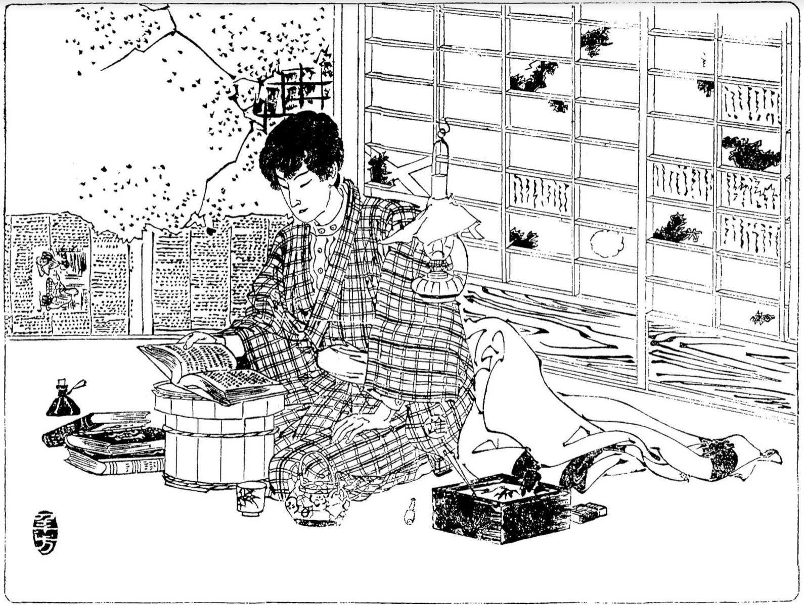 進入明治二○年代,插畫裡經常出現書生的房間。那是一個西學的時代,此時被稱為書生的人,若不是在明治時期出生,便是懂事後已經受到文明開化之光洗禮的世代。既然是在這種時代立志學習西學,身邊配置許多「洋物」便是很自然的事了。
