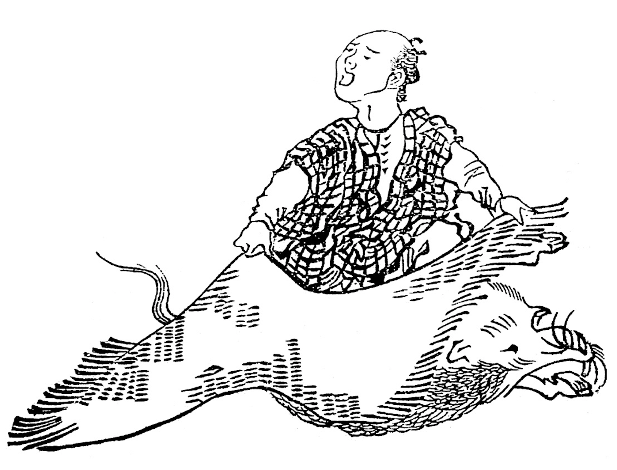 從報紙來觀察,明治八年十月的《東京平假名繪入新聞》中有一張插畫,看似和服裡穿著襯衫(圖四),其實這是橫濱的人足(相當於今日從事土木工程、搬運貨物作業等勞力工作的人),他在河邊發現溺斃的山豬。連丁髷的男人都穿著襯衫,可見這種和洋混搭的服裝一定很常見。