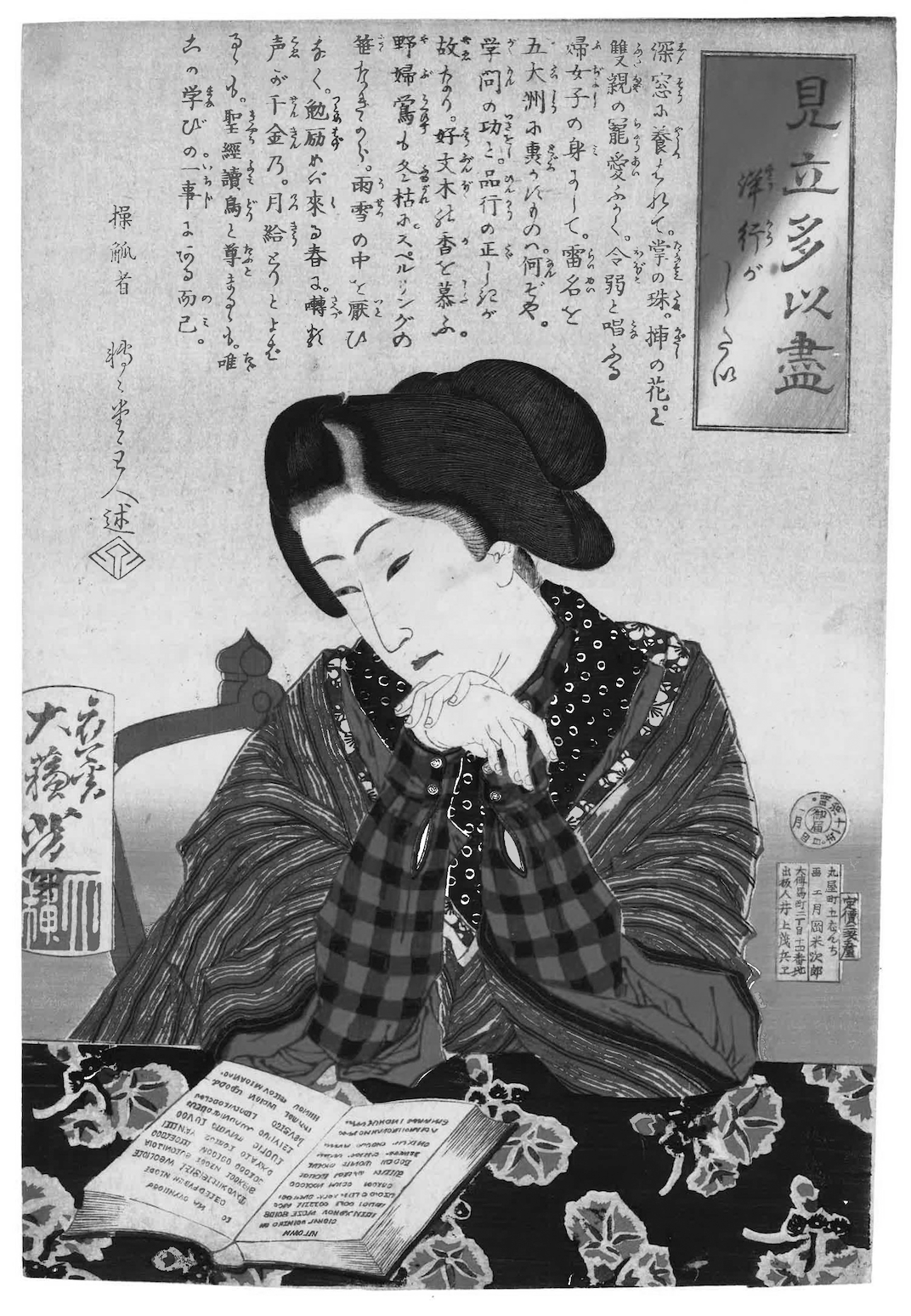 西書放在身旁,和書生義雄一樣,女性對西方的憧憬與男性相同。紅黑相間的法蘭絨格子襯衫,紫色絞染半襟的襦袢(襦袢為穿著和服時外衣與內衣之間的中衣;半襟則為襦袢的領口),其上穿著藍底繡有小花的和服,再套上茶褐色的條紋鋪棉外衣。無論在什麼時代,年輕女性對於新時尚的堅持始終不變。