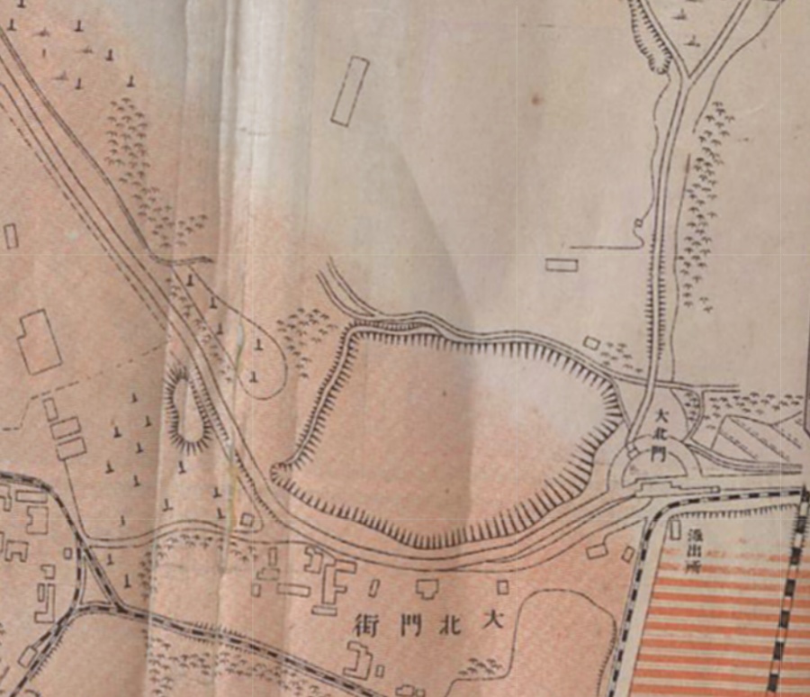 到了日治時期公園建造前1907年的地圖上可以看見北門及城牆都還在,城外是水潭,城牆內外均有墓地(⊥的符號)、竹林及部分建物。但從1912年總督府公文中的〈臺南公園敷地豫定圖〉,可以清楚看到北城牆外水潭的西北側村居的建築分部。這些就是後來遷建的乞丐寮區域。