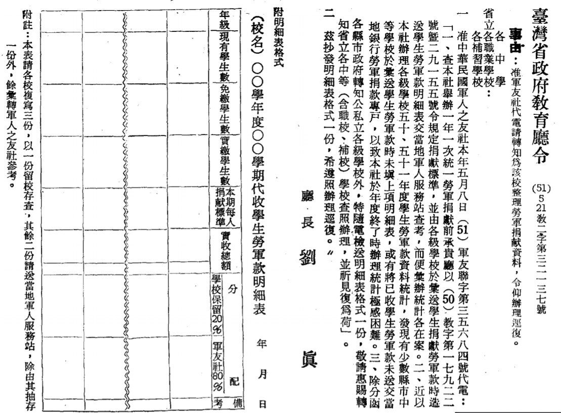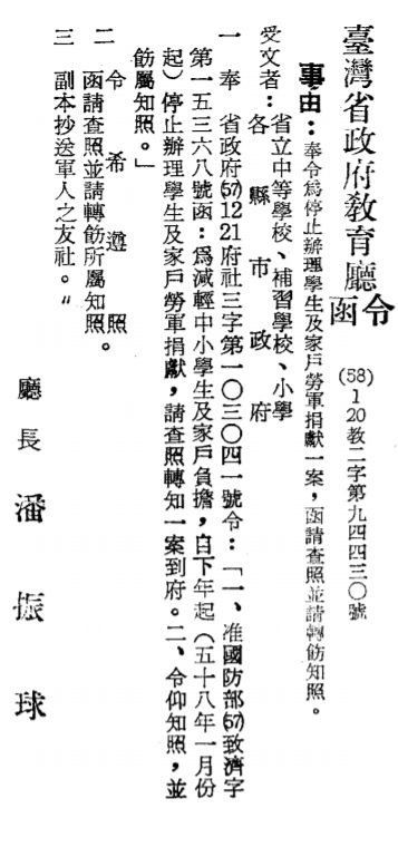 台灣省教育廳因而在1969年1月再度通令各中小學校,不得向中小學生及家戶代收勞軍捐款。