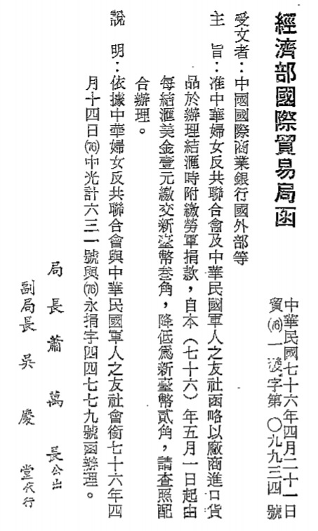 1953年還進一步規定進口結匯要加徵20%的防衛捐,1954年連匯出結匯、國際航空票價也都要防衛捐。