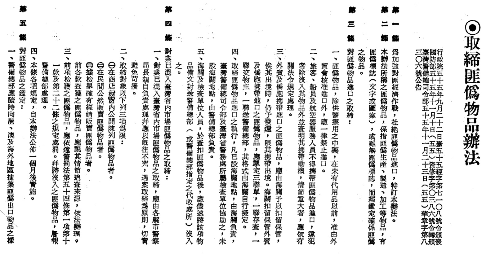 因此,行政院於1966年底制定「取締匪偽物品辦法」,嚴禁旅客入境時攜帶匪偽物品,商家也不得販售、展售匪偽物品。