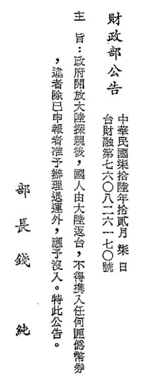 與中國間的貿易,政府則在1985年鬆綁為轉口貿易,可在不與中國直接通商、不與中國代表直接接洽、政府不干涉等基本原則下,將國內貨品輸出中國,但仍不得進口中國貨品。