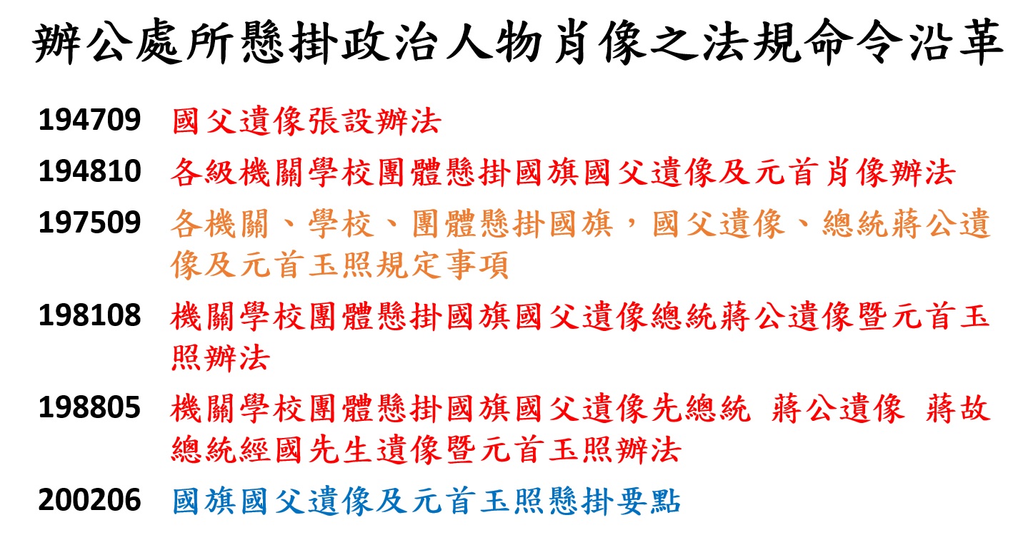 至於唯一有法可循的孫文遺像,民進黨立委高志鵬曾於2015、2016年提案修正「中華民國國徽國旗法」,擬只保留國旗,不再懸掛孫文遺像,仍因國民黨陣營的強烈反彈而石沉大海。