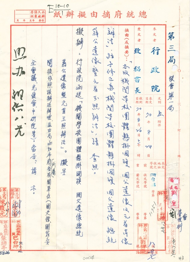 直到蔣介石1975年過世後,行政院即於1975年9月頒布「各機關、學校、團體懸掛國旗,國父遺像、總統蔣公遺像及元首玉照規定事項」,除了原先規定的孫文遺像,已從肖像晉升為遺像的蔣介石外,右方牆壁要掛上總統肖像,左方牆壁則掛副總統肖像。