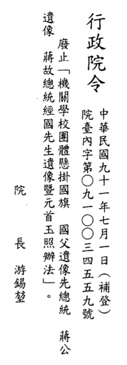 行政院則於2002年6月改訂「國旗國父遺像及元首玉照懸掛要點」,並廢除「機關學校團體懸掛國旗國父遺像先總統 蔣公遺像 蔣故總統經國先生遺像暨元首玉照辦法」。規定只懸掛孫文遺像與現在總統肖像,正式讓兩蔣遺像退位。