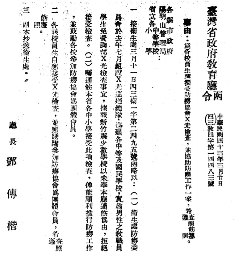 國民黨政府在獲得美援、聯合國的協助後,展開結核病防治計畫,陸續設置台北結核病防治中心、台灣省立結核病防治院、嘉義結核病防治中心、台南結核病防治院,開始引進卡介苗。蔣宋美齡也在1952年號召成立台灣省防癆協會,並於1958年擴大為中華民國防癆協會。