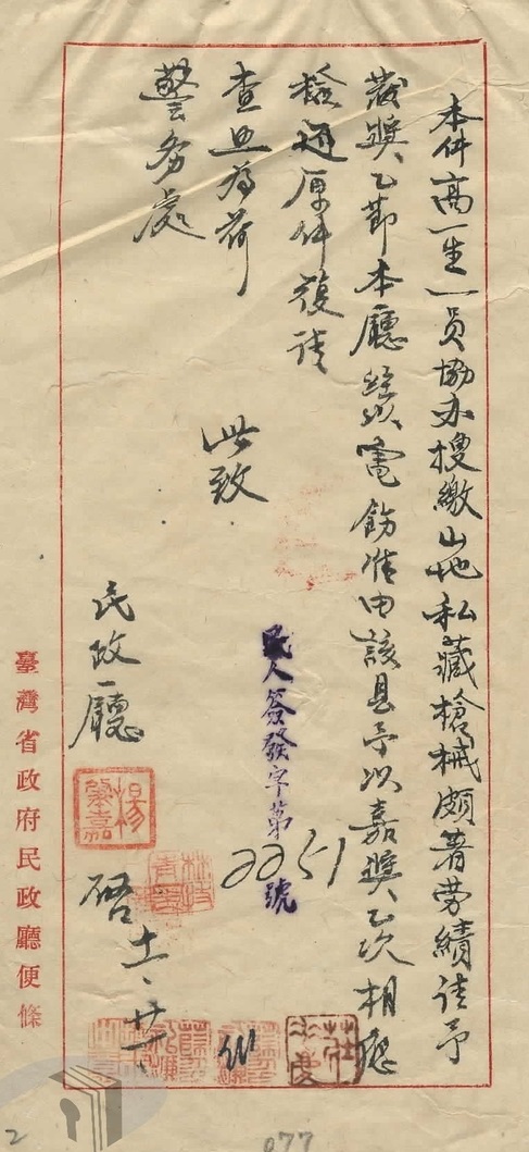 當然,最主要的是中國國民黨政權在剷除台籍菁英之後,開始對原住民菁英下手,因此,儘管1950年四月間,湯、高等人曾經向保安司令部「自首」,高一生且曾「協助辦理山地私藏槍械頗著勞績」,而獲得省政府嘉獎(請見附圖文件),但是,中國國民黨特務仍嫁禍他們「怙惡不改」。