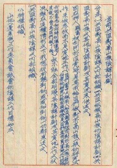 另外,特務更替他們制定了一種〈蓬萊族政策方案〉,包括:一、組織山地自治政府,二、平均地權(這個政策不是孫中山的嗎?),三、組織自衛隊。