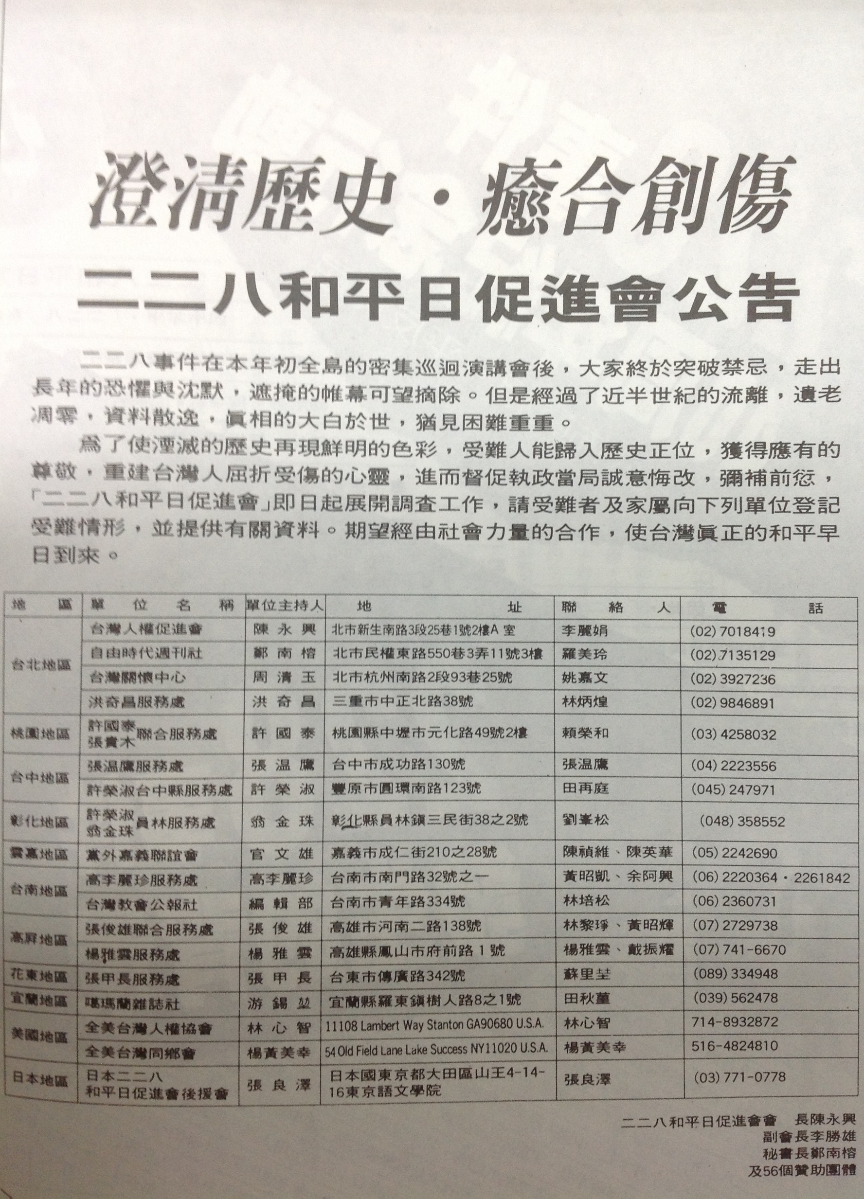 「1978年2月⋯一群政治反對運動者成立了228和平日促進會⋯在⋯陳永興的帶領下,集合了許多民進黨領導人物與支持者,包括<笠>⋯台灣筆會等文學或文化團體。1987年初,二二八和平日促進會在全台各都市發動一連串群眾集會與街頭遊行,要求國民黨政府公布事件真相,並且替國民黨軍隊大屠殺下的受難者平反寃屈、恢復名譽。」