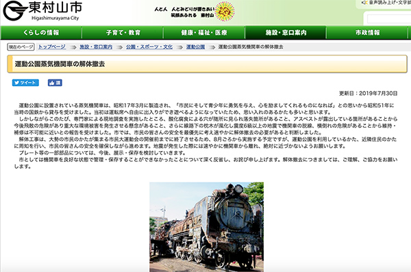 最近在東京都的東村山市,有一群當地住民,向市役所陳情,希望能夠保全當地運動公園裡,一輛狀態不佳的靜態保存蒸氣機關車,然而在市役所的方針下,這輛破損嚴重的機關車,最終還是遭到解體的命運。