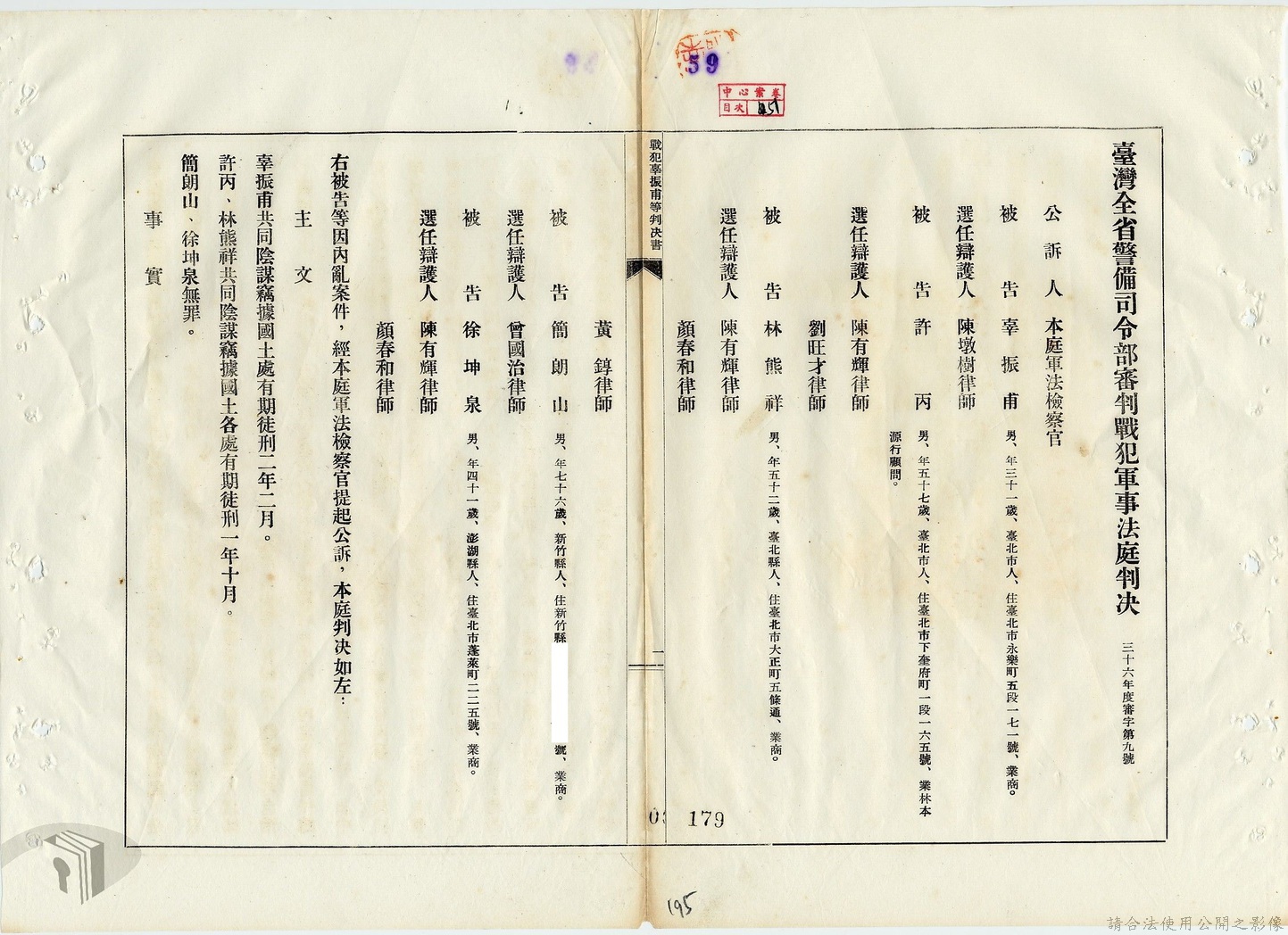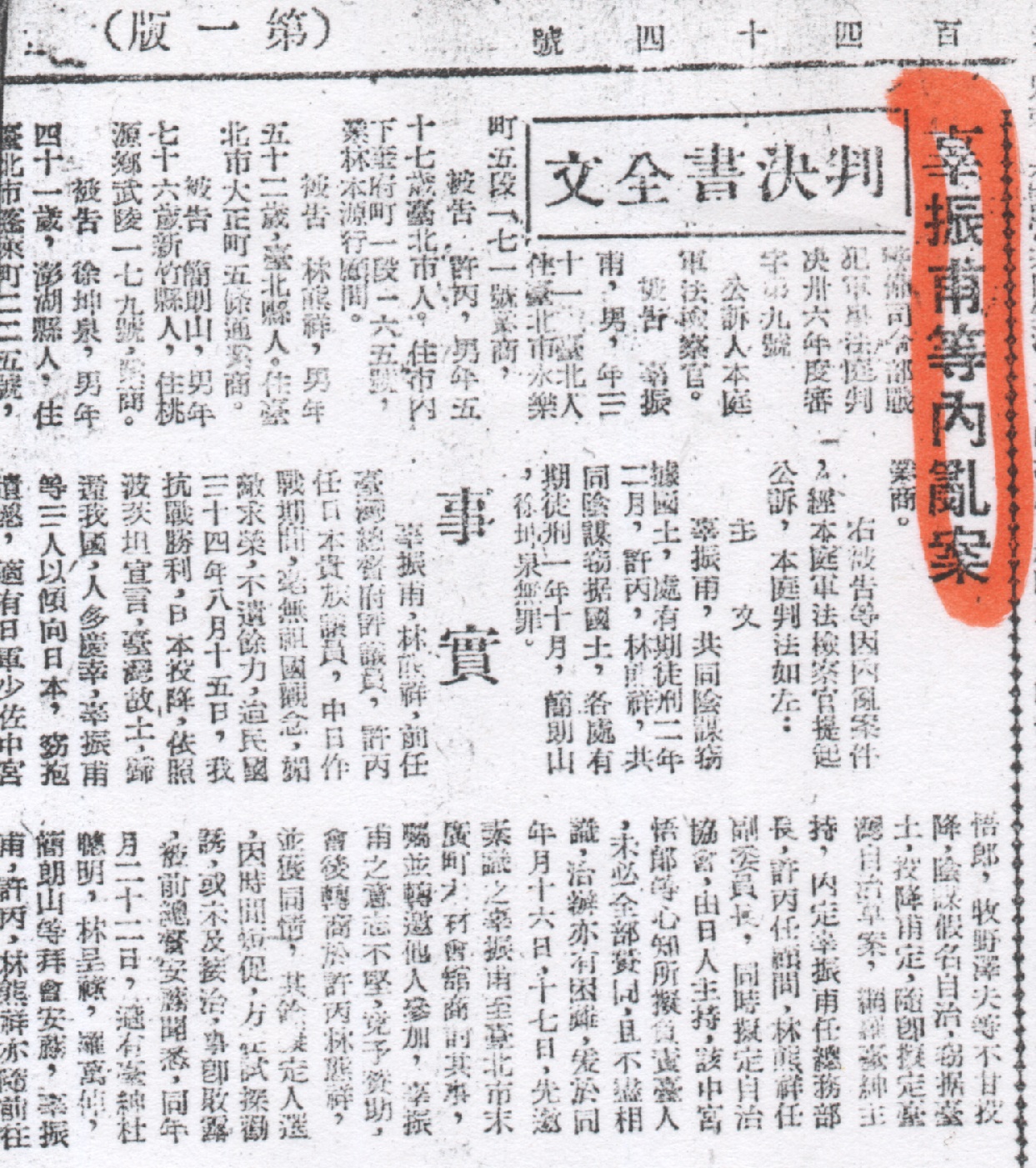 審判戰犯軍事法庭指稱他們「所稱自治,旣係為日本着想,並與日入共策進行,則其係假自治之名,行竊據台土獨立之實,明若觀火,百喙難辭」,最後,辜振甫判處二年二個月有期徒刑,許丙、林熊祥二人各判處一年十個月,其餘全部無罪開釋。