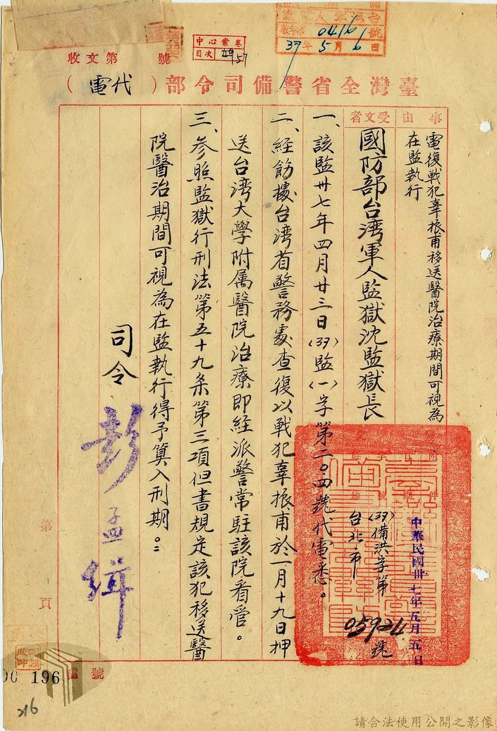 另外,在此期間,國民政府國防部三番兩次向台灣省警備總司令部關切該案,舉凡他們被押時間的更正、傳訊期間要不要計入刑期、是不是要讓他們保外就醫等等,公文頻繁來往間,警總悉數照辦。以上種種待遇都不同於其他的「戰犯」。