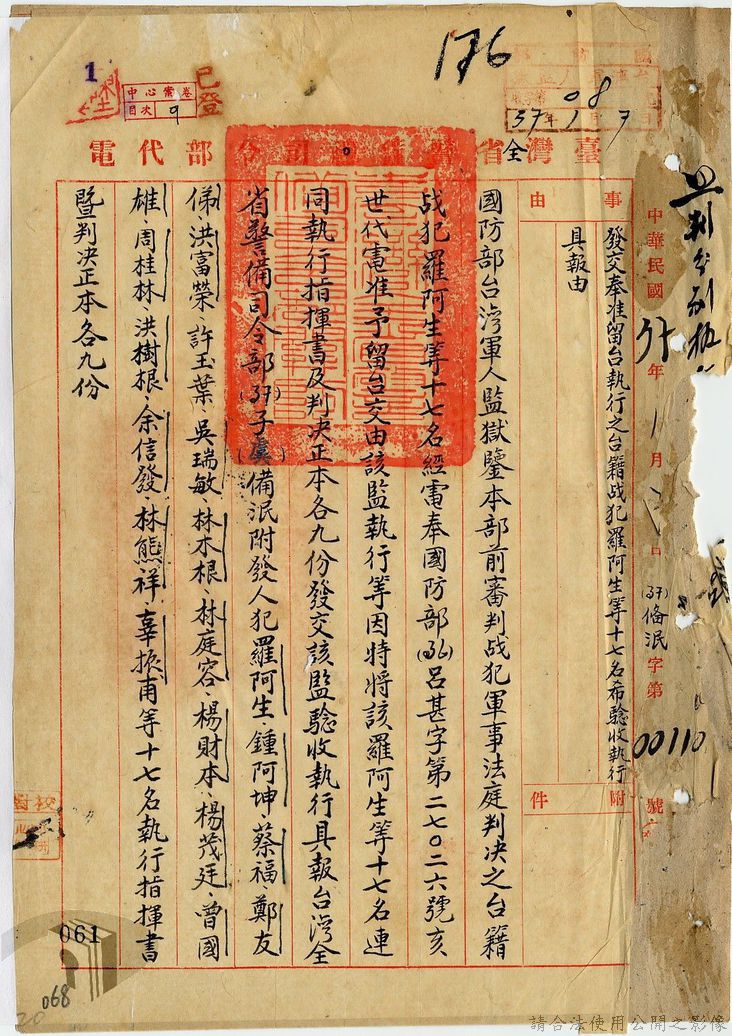 這可從判決過程看出端倪,臺灣全省警備司令部審判戰犯軍事法庭在1947年7月9日宣判,對於判決法條不斷研商推敲,到7月29日決定引用一堆《戰爭罪犯審判條例》法條定罪;後來判決書在8月11日定稿時,又增加刑法條文,經過層層審核確定,最後在12月29日才由警總行文軍人監獄諭知被告。
