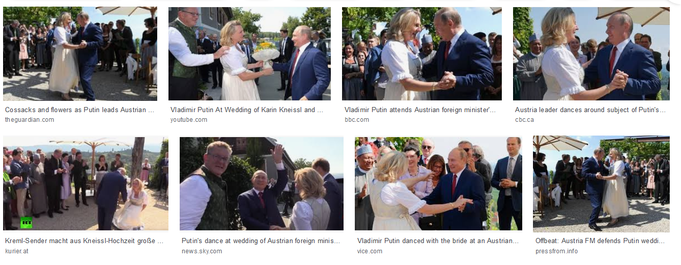 2018年前奧地利外交部長克奈瑟Karin Kneissl結婚,她本身是著名的能源專家兼記者,也與各國領導人有著或多或少的私交。而俄國總理普丁浩浩蕩蕩帶了一堆隨從前來參加婚禮,引起輿論一片譁然。要知道,俄羅斯與歐盟的關係向來緊張,普丁在歐洲的一舉一動總是受到矚目。