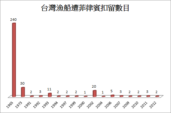 由於台灣與菲律賓距離很近,因此,台灣漁船遭菲律賓扣留的數字驚人。迄今,政府相關單位並沒有公布具體的數字,因此,相關統計只能透過媒體的零星報導來拼湊全貌。