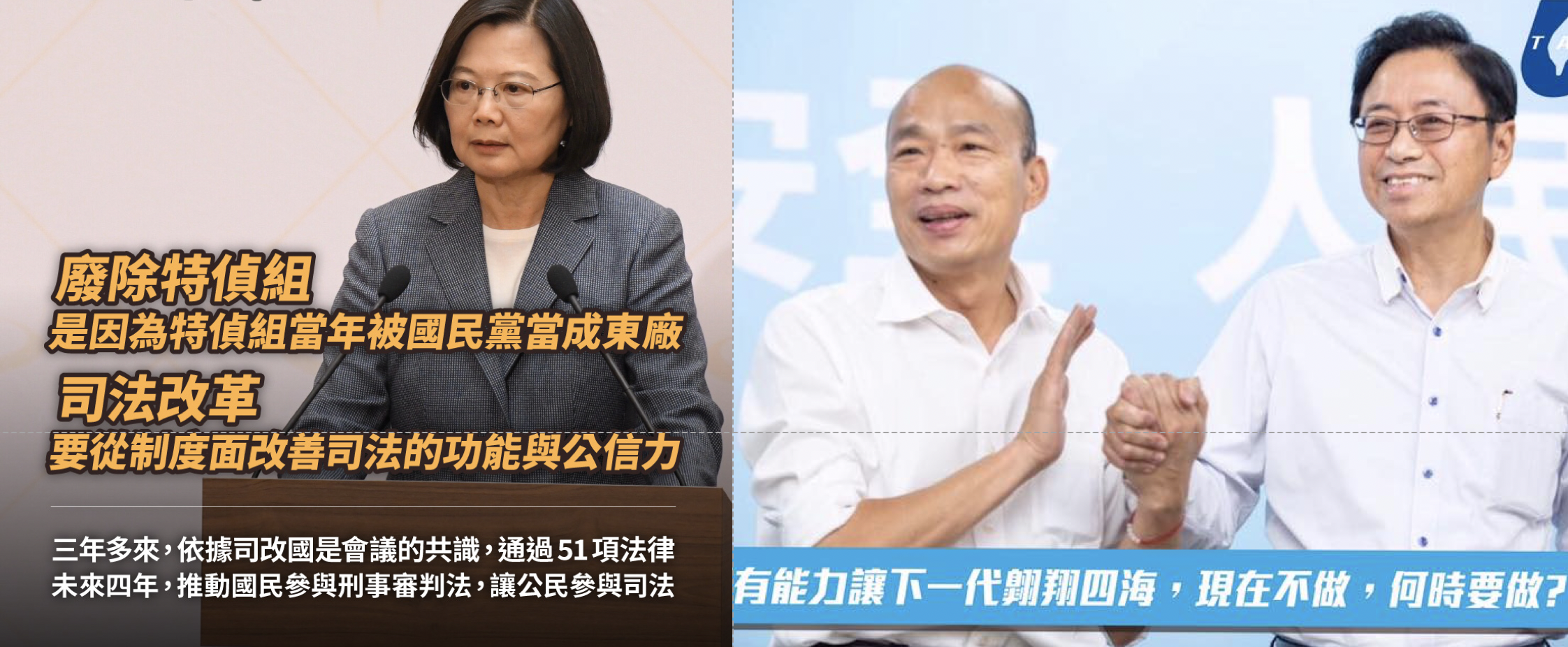 第二次總統政見會上,韓國瑜市長指控民進黨貪腐,強調主張恢復特偵組,遭蔡英文總統以林益世、李朝卿、葉世文等國民黨高官貪污案件舉例打臉,並反擊說韓的政壇大哥就是因為貪污,現在還關在牢裡。韓空言恢復特偵組,顯然缺乏國際觀與法治教育。