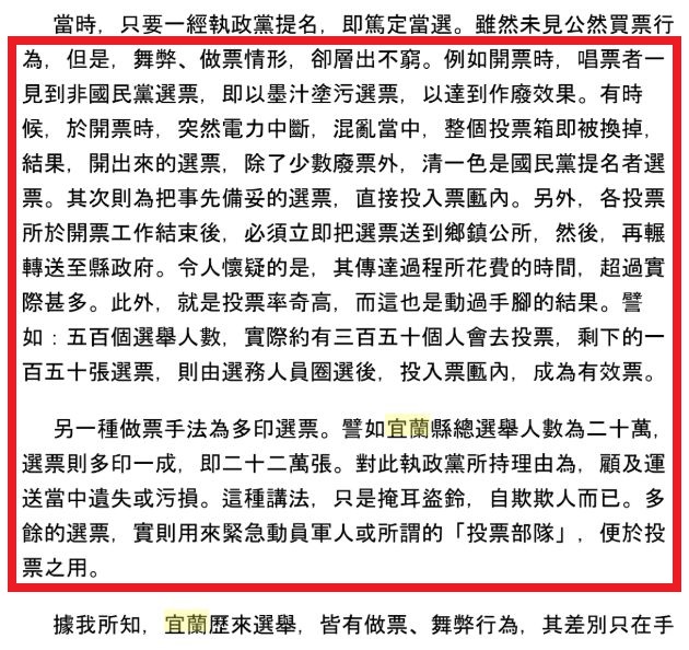前台北市長、交通部長高玉樹就曾在〈回憶錄〉中指出,「國民黨在台灣辦選舉,很少是乾淨的。講的是一套,做的是另一套,往往為達目的,不擇手段,寧可失去民心,也要贏得選舉」。已故有「台灣史懷哲」之稱的陳五福醫師也曾在回憶錄中,痛陳中國國民黨齷齪骯髒的作票手法,非常不恥戕害民主選舉的作為。
