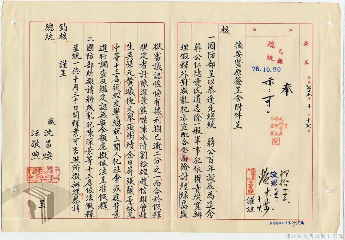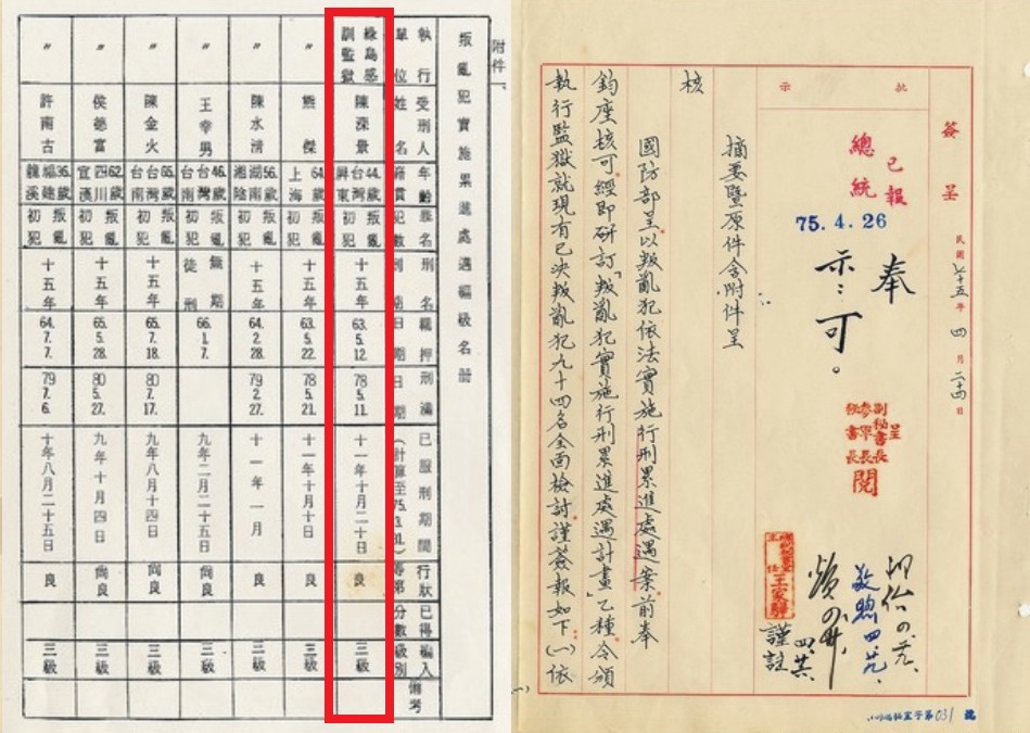 由於陳深景減刑後的刑期已逾二分之一,國防部認為他合於假釋規定,而且「悛悔有據」,因此,以他為首十三名監禁於火燒島的政治犯,在同年10月30日才獲得假釋出獄。