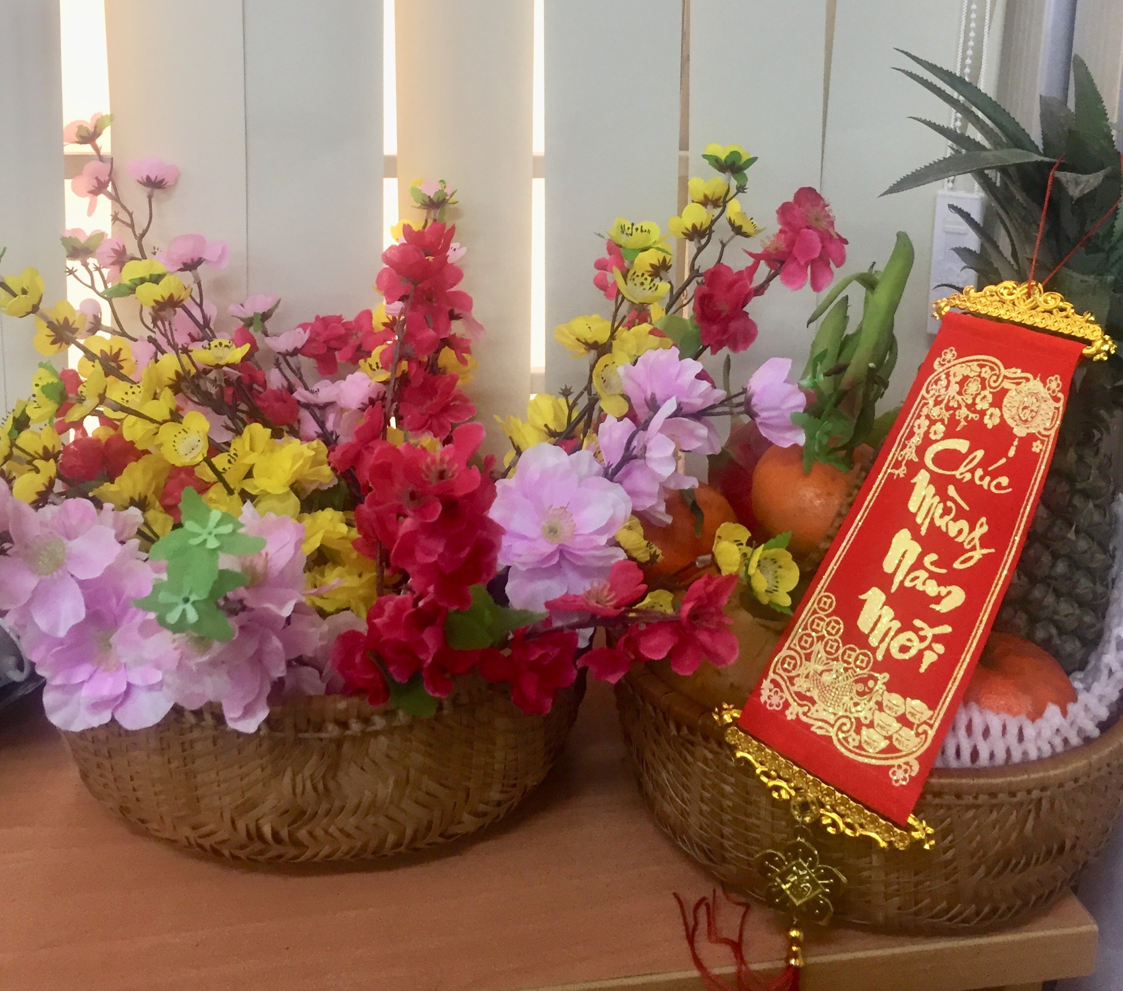 過年期間的布置少不了花。越南過年常見的花為桃花、黃梅花及金桔。越南北部人喜好粉紅桃花,中部及南部則偏好黃梅花。結有金黃色果實的金桔樹象徵豐收的一年則全國討喜。過年期間幾乎家家戶戶都會布置金桔、桃花或黃梅花。此外,南部人過年時常擺著一盤五種水果來祭拜神佛祖先。這水果盆就是「mãng cầu」(釋迦,代表請求之意)、「sung」(無花果,代表充滿、富足)、「dừa」(椰子,代表剛好之意)、「đu đủ」(木瓜,代表足夠之意)、「xoài」(芒果,代表花費之意);這就是說家家戶戶都希望新一年來臨,可以賺到足夠的金錢來過日子(參閱陳玉添《探索越南文化本色》)。