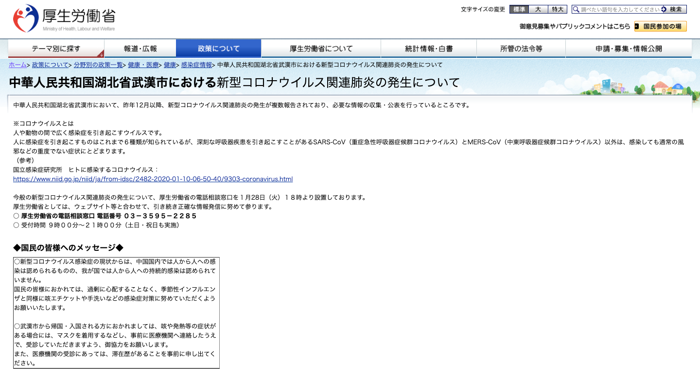 日本厚生勞動省在官方網站上宣導,指出中國國內雖有人傳人病例,但日本並未出現人傳人的持續感染,民眾不需要過度擔心,和季節性流感一樣,注意咳嗽時的禮儀、多洗手;若有前往武漢或者從武漢回國的經驗,且出現咳嗽、發燒等症狀,再請戴上口罩就醫。這是官方的態度。