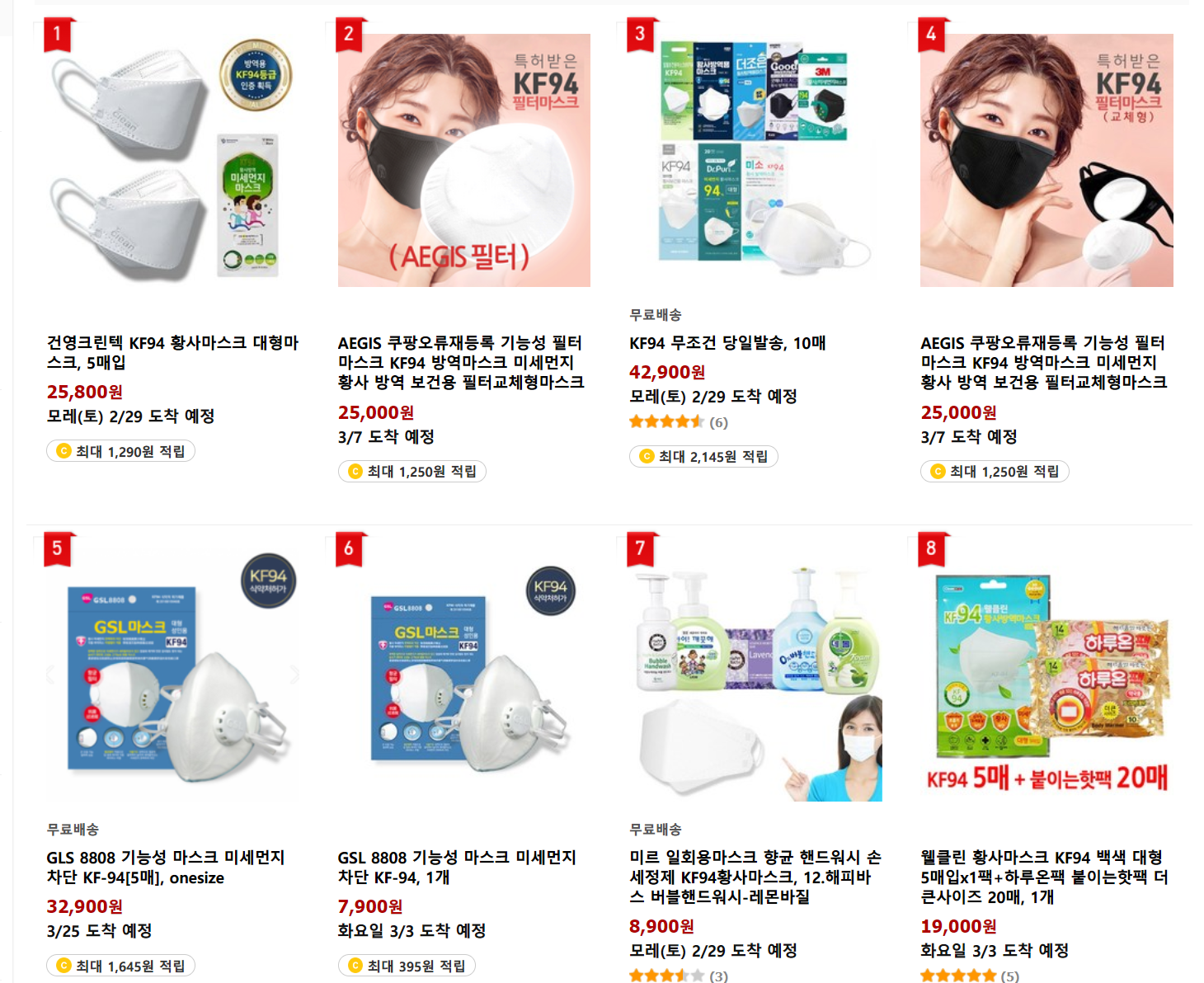 近兩週,首爾市的實體商店內,南韓民眾常購買的防細懸浮微粒與黃沙口罩,一個大約2000至3000韓元(約新台幣55到84元),連鎖生活用品店大創,則以每張1000韓元(約新台幣27元)的低價販售。[註:價格會隨首爾市內各區域、口罩等級與單片/數片裝而有若干差異]