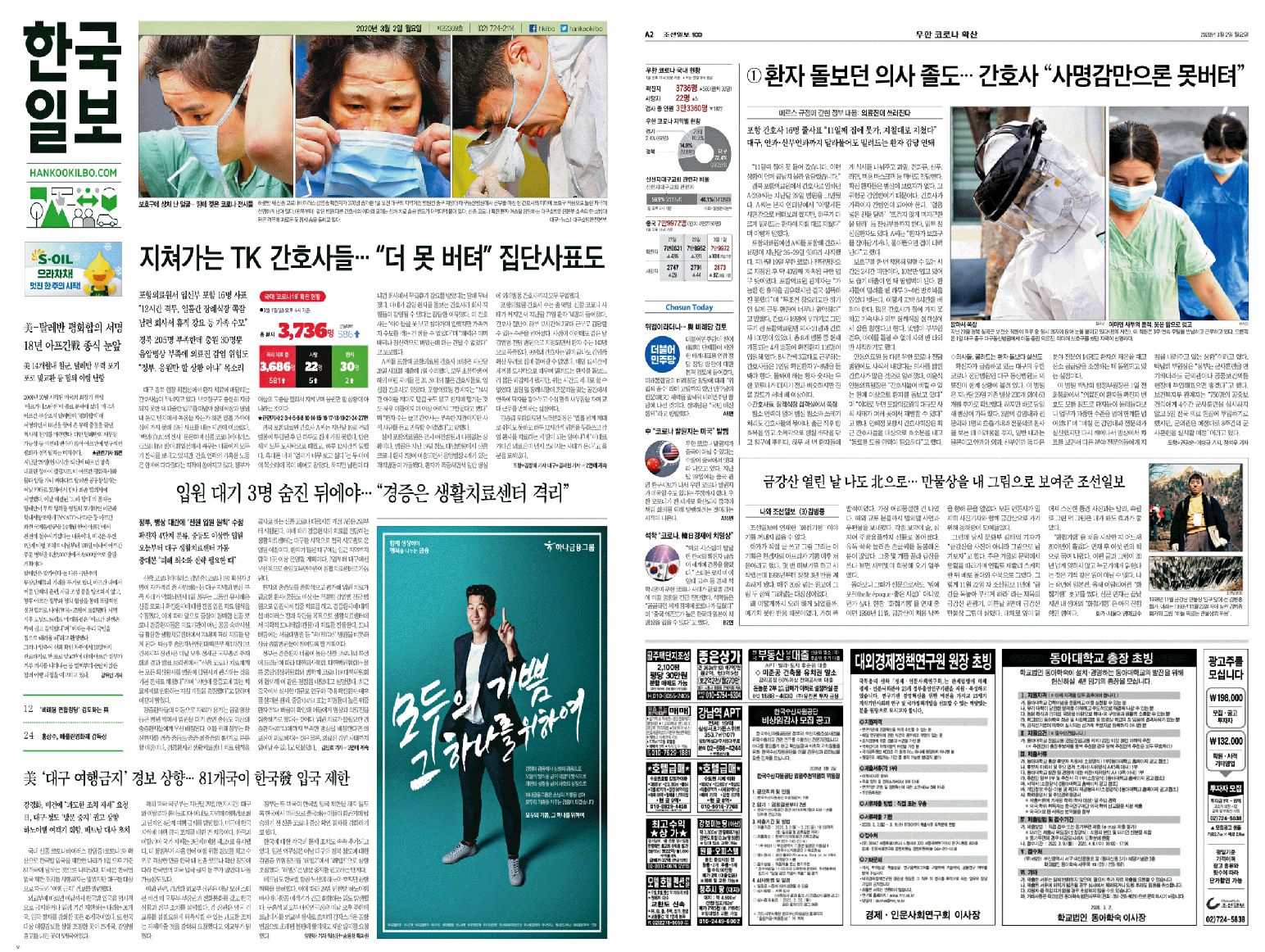 「在大邱及慶北現場最前線,埋首治療患者的護士們正在崩塌中。他們連保護裝置都沒被充分支給,承擔著過重業務,只能在喪葬場(太平間)和院內通道的凳子上稍息片刻,有近10天都無法回家,現在到了要集體辭職的困境。」─《韓國日報》202032日,頭版。