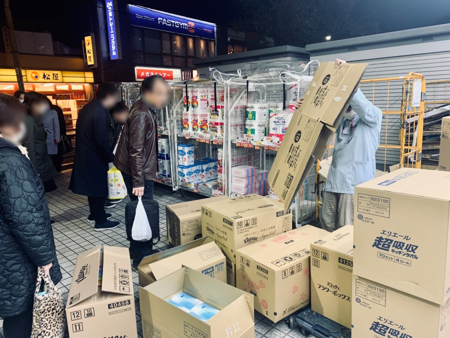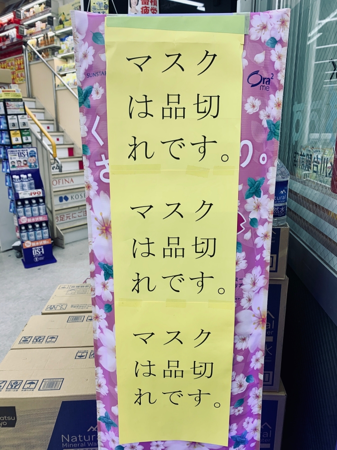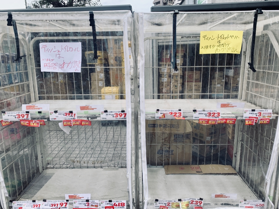 除了口罩之外,舉凡消毒液、乾洗手、除菌濕紙巾等各種只要標記上防「ウイルス」(病毒)的商品,上架必缺貨。晚了台灣約一個月的「衛生紙之亂」仍持續上演,雖然能在Twitter上看到大型量販店帥氣進貨堆積如山的衛生紙,但地方型的藥妝店還是很缺貨。也許是因為詢問度高到讓店員太困擾了,店頭各個角落都貼上了「目前缺貨中」、「進貨時間未定」,「口罩賣完了」更是一排就得貼上三張,就深怕不夠顯眼。