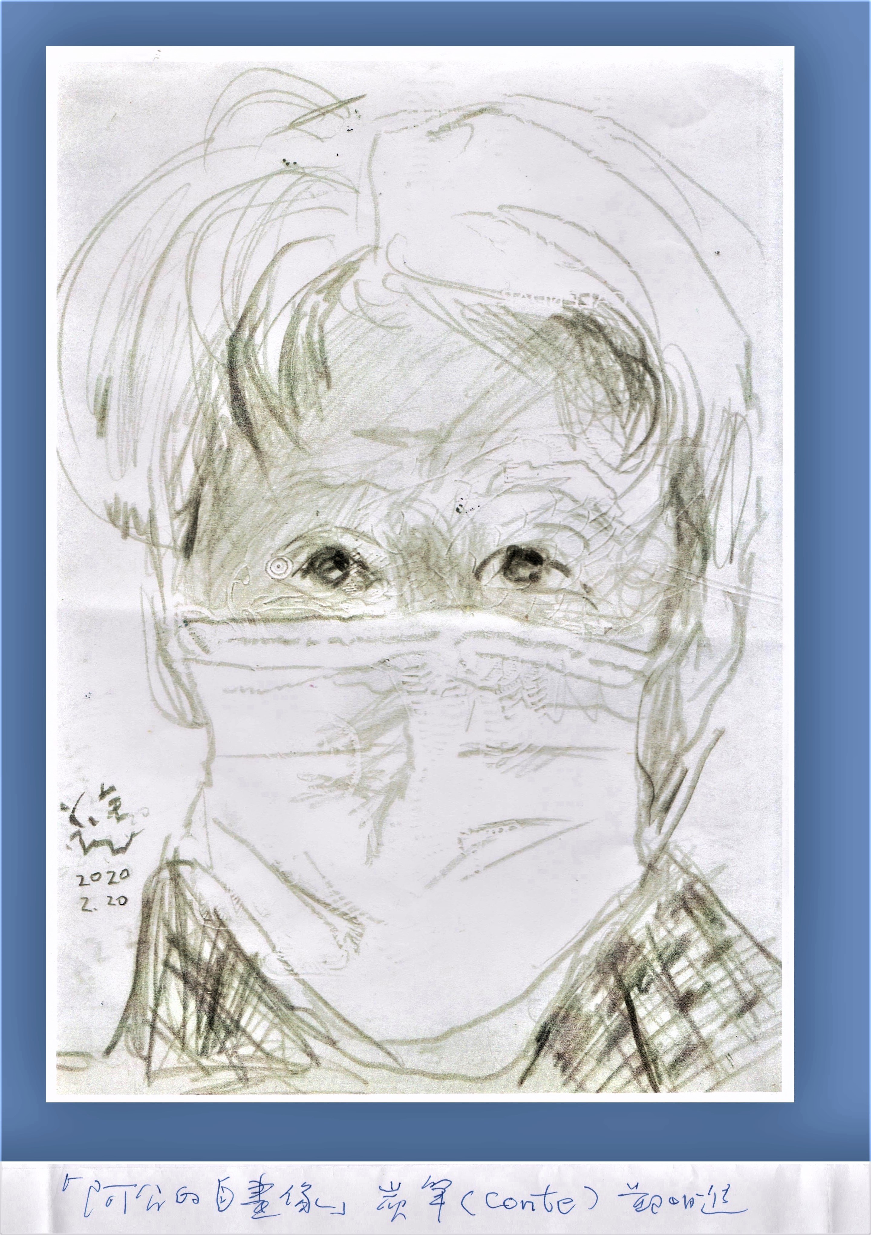 那如何來創作呢?他說只要準備一面小鏡子,看著鏡中戴口罩的自己,慢慢觀察、慢慢畫,就可以完成一幅「戴口罩的自畫像」。他自己先畫,用炭筆畫,他很滿意自己的線條,而且他一口氣就畫了好多張,但是最滿意的還是最開始的第一張,第一張最有神韻。他又說,看著鏡中的自己,眼睛最重要,透過鏡子,用眼睛觀察細節,也用眼睛看著眼睛,因為口罩遮住了大半的臉部,所以眼睛,更成為整張圖最能表現的重點。