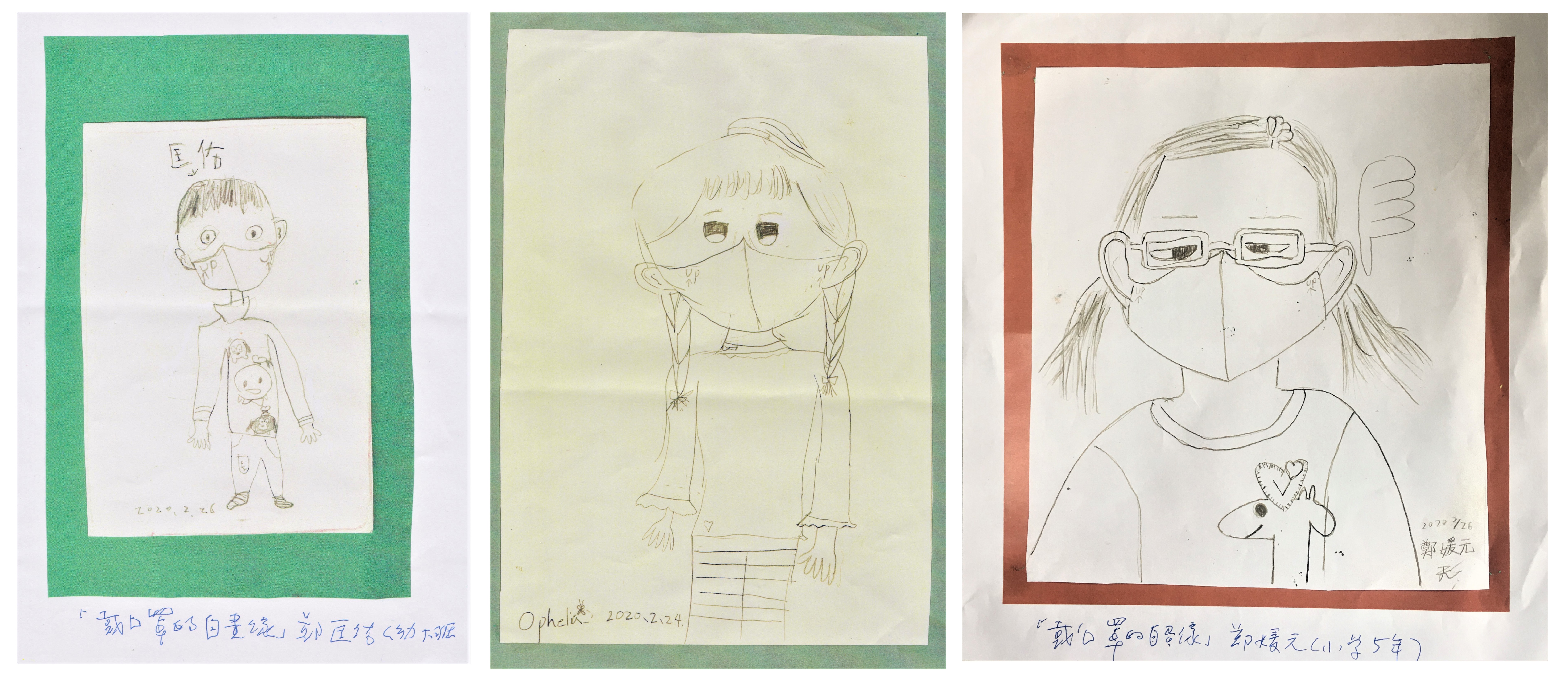那為什麼要畫自畫像呢?為什麼不畫別人戴口罩就好呢?鄭老師給了我很棒的理由,因為畫「自己才有感情啊!你看別人的臉,不會有感情啊!」好個「有感情」的答案啊!我想想,還頗有幾番道理。自己的臉,應該是自己相處最久的臉,而大家多久沒有好好看看自己的臉了呢?而戴口罩的自己,大家是不是也能專心地來看、專心地來觀察描繪呢?鄭老師不但自己畫了戴口罩的自畫像,也讓三個孫子,分別是小學五年級、二年級跟幼稚園大班的孩子,進行這個主題創作,然後鄭老師以無比的熱情,將圖畫彩色影印,寄送給一些朋友,甚至於孫子們的校長也收到了。有一天,孫女回家告訴阿公,校長走到教室讚美她,跟她說妳畫的戴口罩自畫像,畫的很仔細喔!這樣子的過程,阿公影響了孫女,阿公也影響了校長,校長又回過來影響孫女,整個善的循環中,似乎看到很多教育的關懷。
