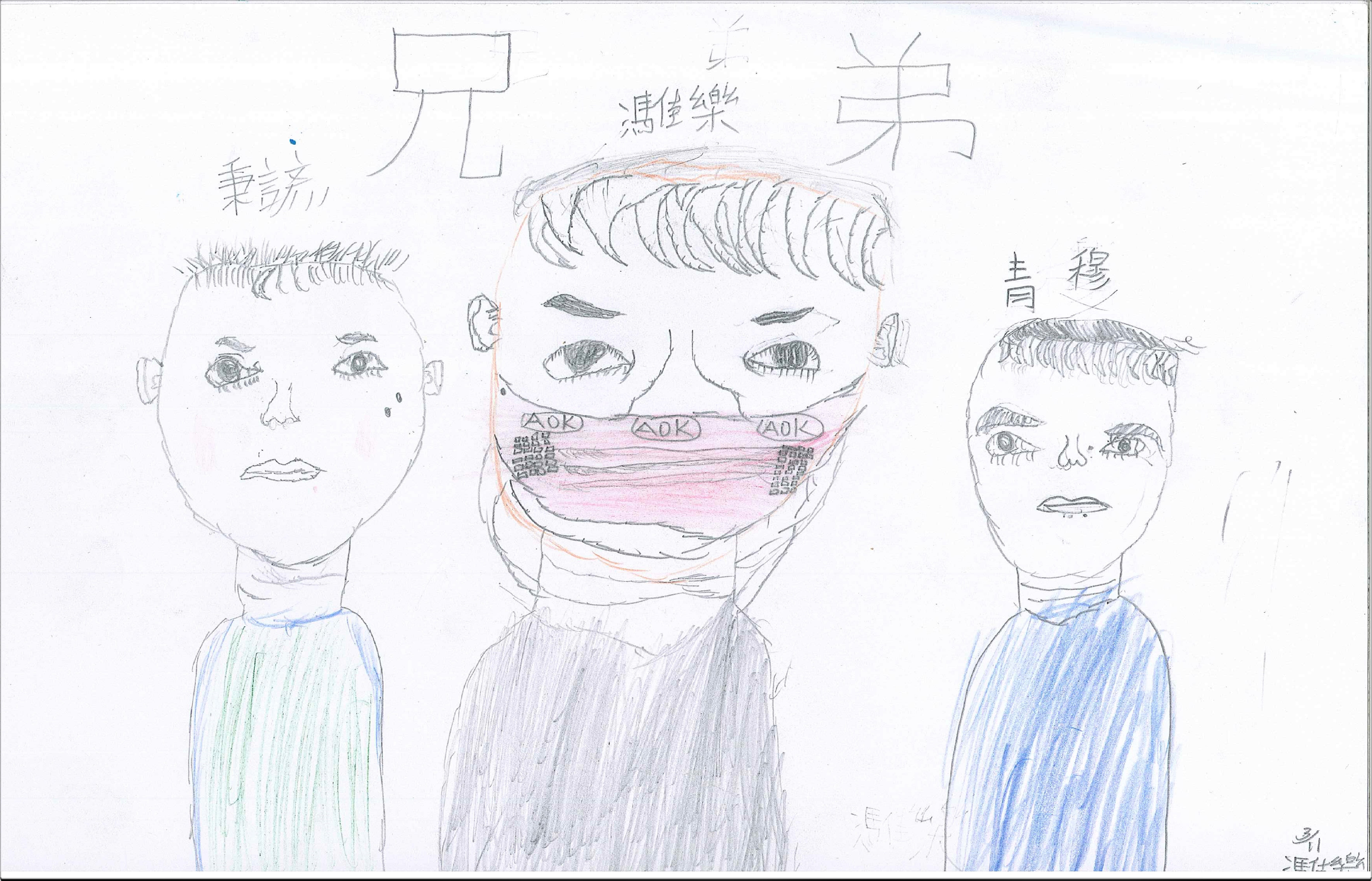 一位平日很調皮的大男孩,畫完了自己還欲罷不能,開始找兩位他的好朋友,請他們當他的模特兒,最後在三人圖像上,出現了大大兩個字「兄弟」,他的觀察力真的很棒,連朋友上面的幾顆小小痣,都一一畫出來,大家最後讚美他們三人,是「防疫三兄弟」。而原畫者,也在回家後,補寫了一段深富感情的創作說明: