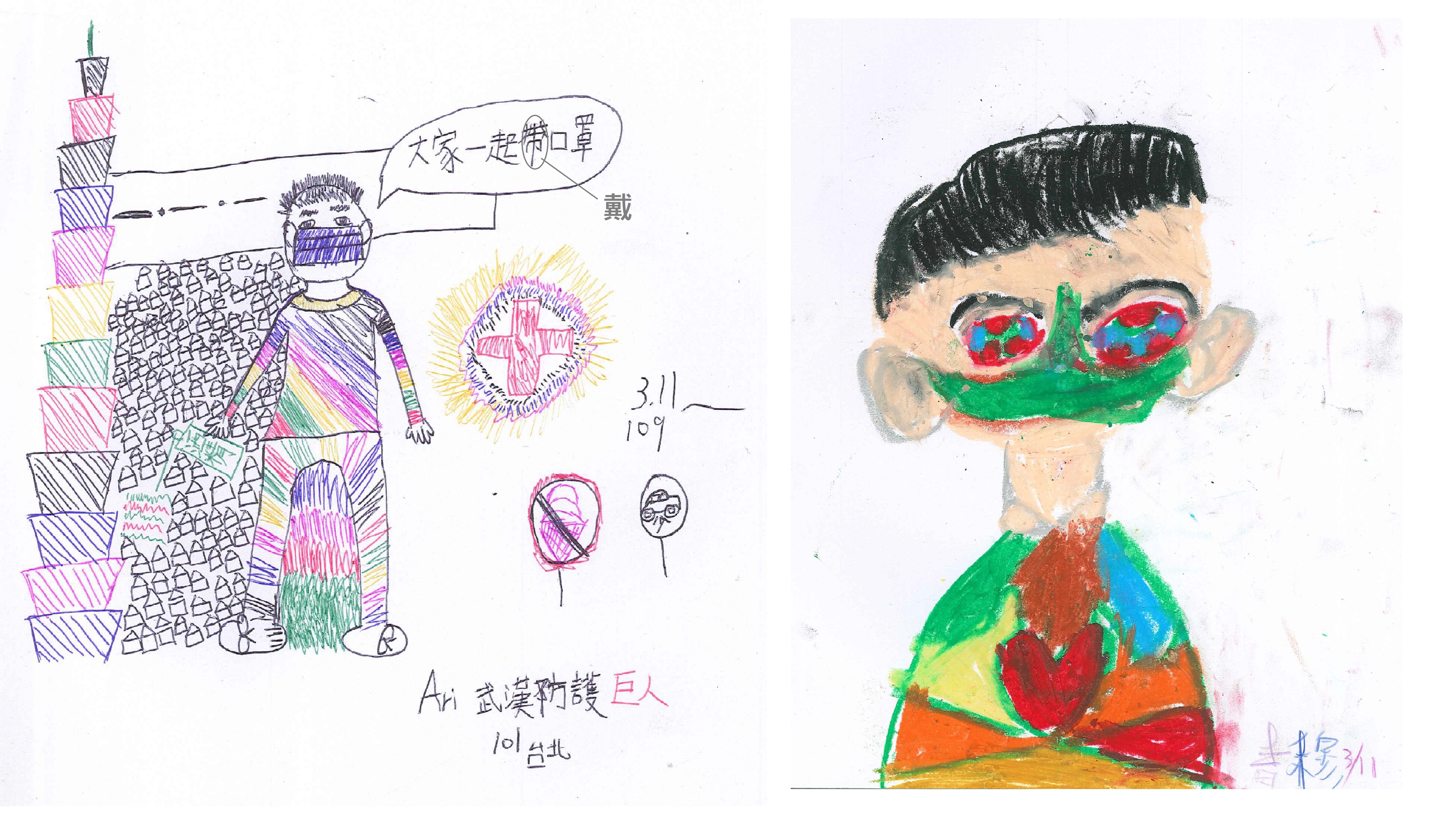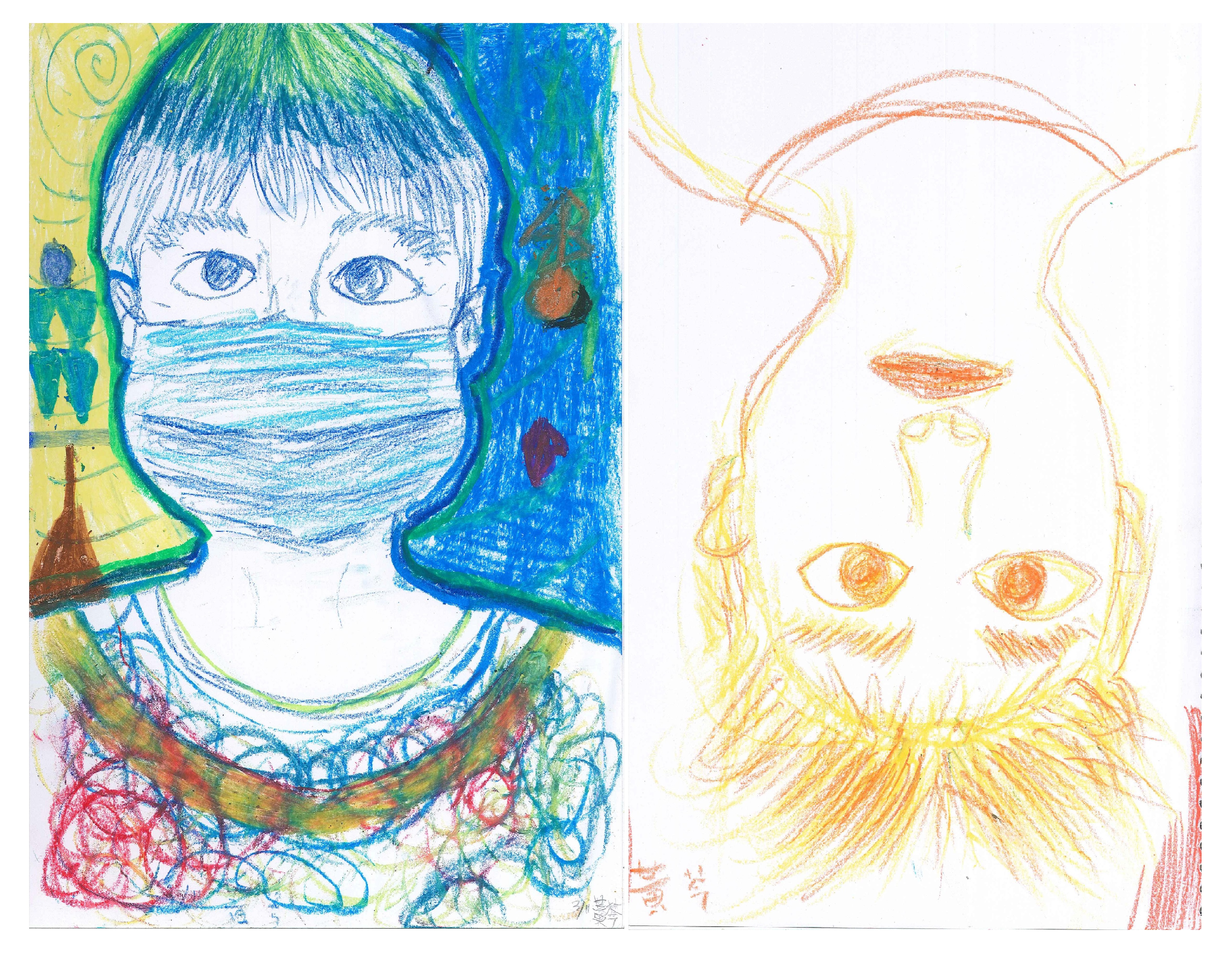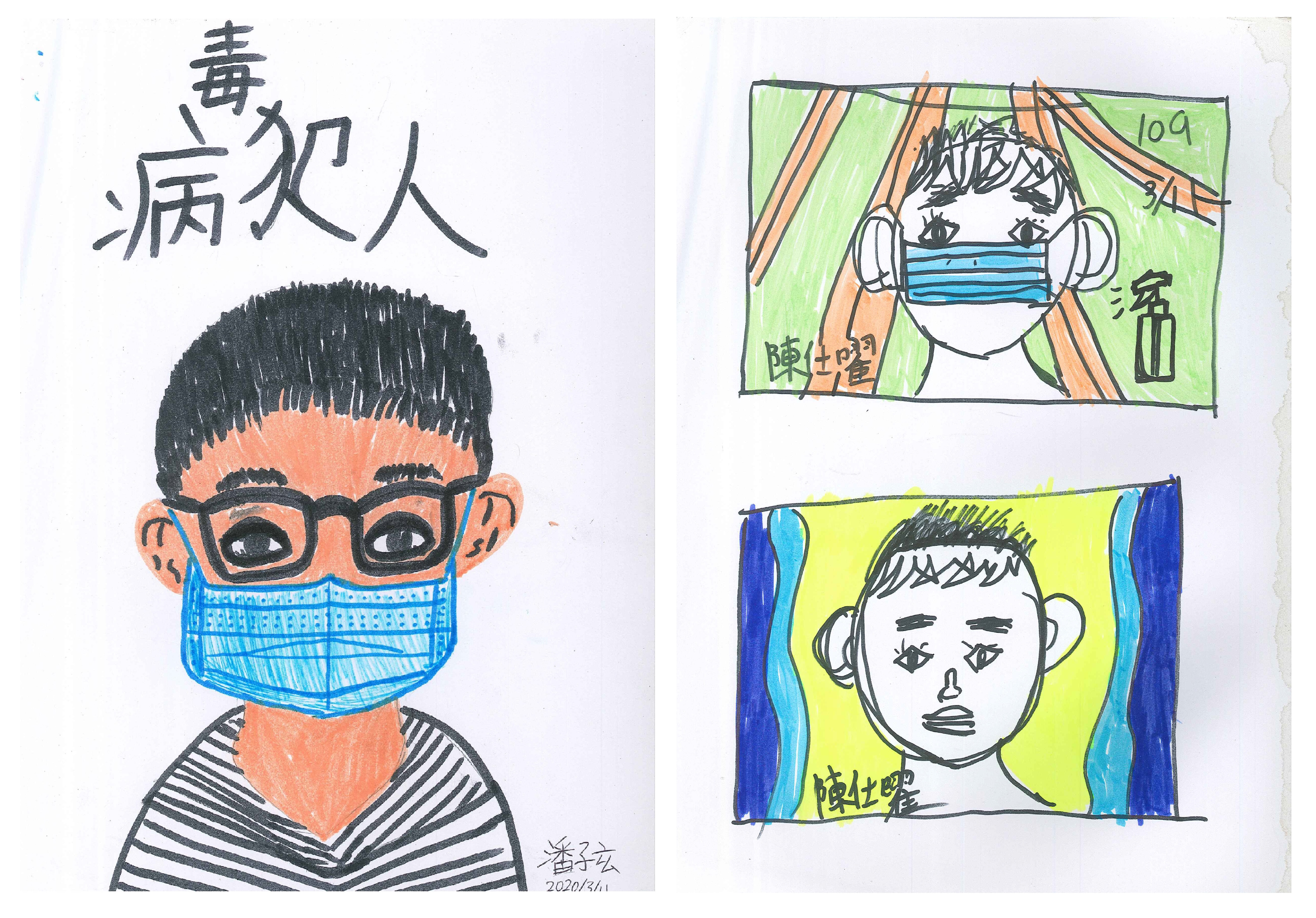 同樣的主題,也有一位孩子,把自己戴口罩的樣子,稱為「病毒犯人」,非常強烈的形容字眼,想法獨特。而這位男孩,在完全沒有打鉛筆稿的狀況下,直接以彩色筆創作,簡潔有力,而且不失細節的描繪,特別是口罩上的紋路、縫製點點的地方,以及放射狀條紋的衣服,都顯現出他傑出的觀察力與表現力。另一位同學,把消毒用的酒精瓶也畫上去了,背景處理很明朗,一上一下兩張有框的圖,分別呈現戴口罩跟沒戴口罩的自己,有孩子說「感覺好像在畫郵票」、「下面那張圖的背景,好像把自己的頭送去洗車場一樣」,這也讓我們聽到的人,哈哈大笑起來。