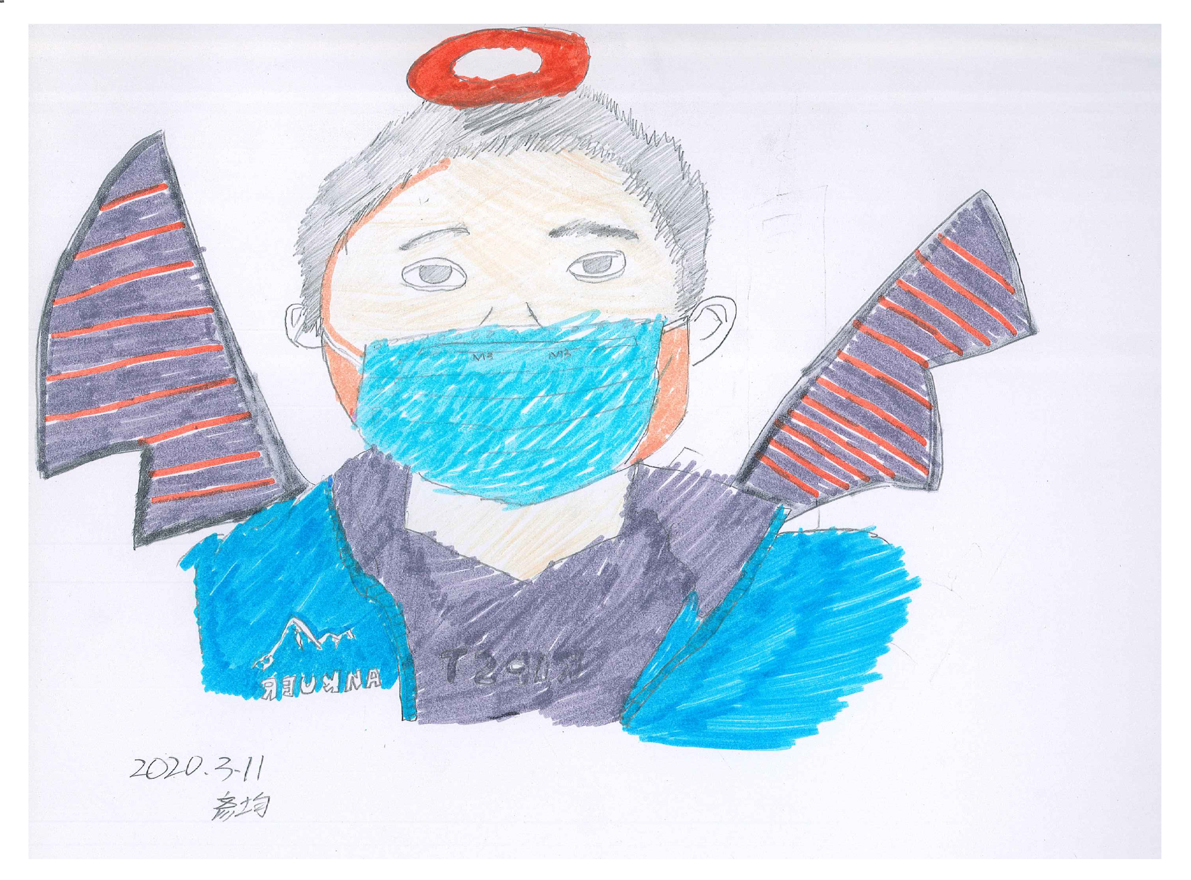 還有一件作品,也引起很多人共鳴討論。這位男孩,竟然在自己自畫像上畫著一個橘紅光環,然後有一對翅膀,同學們一起看作品時,第一個人就說「好像死神!」,然後陸續有人說「好像有惡魔的翅膀」、「好像從地獄出來到地球上的死神」,但隨即又有另外的詮釋,「那是游泳圈啦!他要提醒我們,隨時要戴口罩,即使在游泳時啊!」哈,這樣的觀察點,有趣極了!當然,真實世界游泳時,是沒辦法戴口罩的,但他這樣的解釋,頗有創意。後來原作者男孩,回家寫了一段他的說明文字: