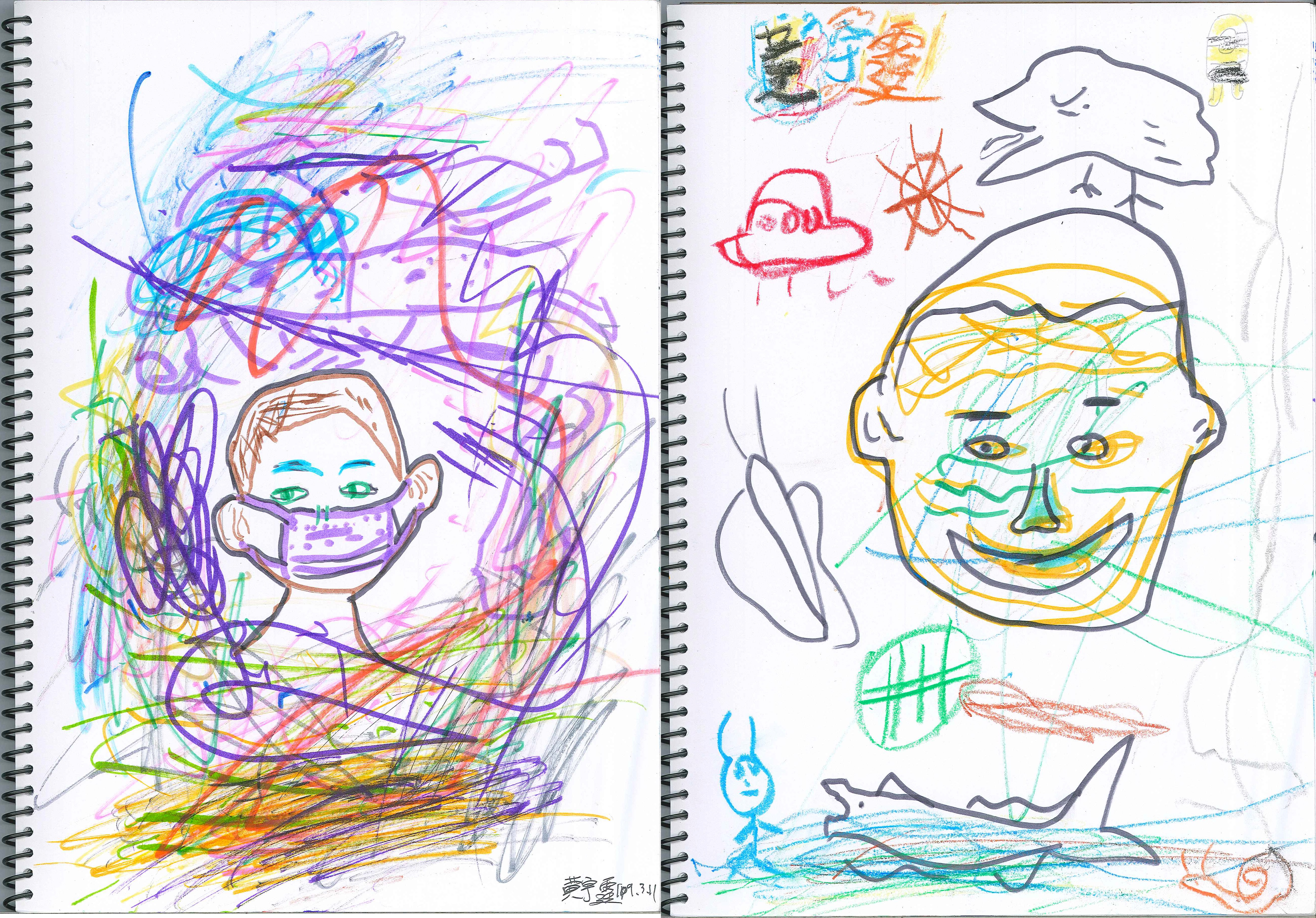 班上還有一位非常斯文的男孩,先是畫錯了線條,最後把畫錯線條當作了畫面的元素,於是出現了跟他平日很不相同的作品來。雖然畫面帶有狂野混亂,但也可看見他的描繪功力不凡,特別是那戴口罩的頭像。另一邊沒戴口罩的自畫像,延續了第一張的亂線風格,但可以發現線條變的更自由,也更有活力。他在自己的文字說明上,寫出了很能代表台灣現狀的觀察紀錄: