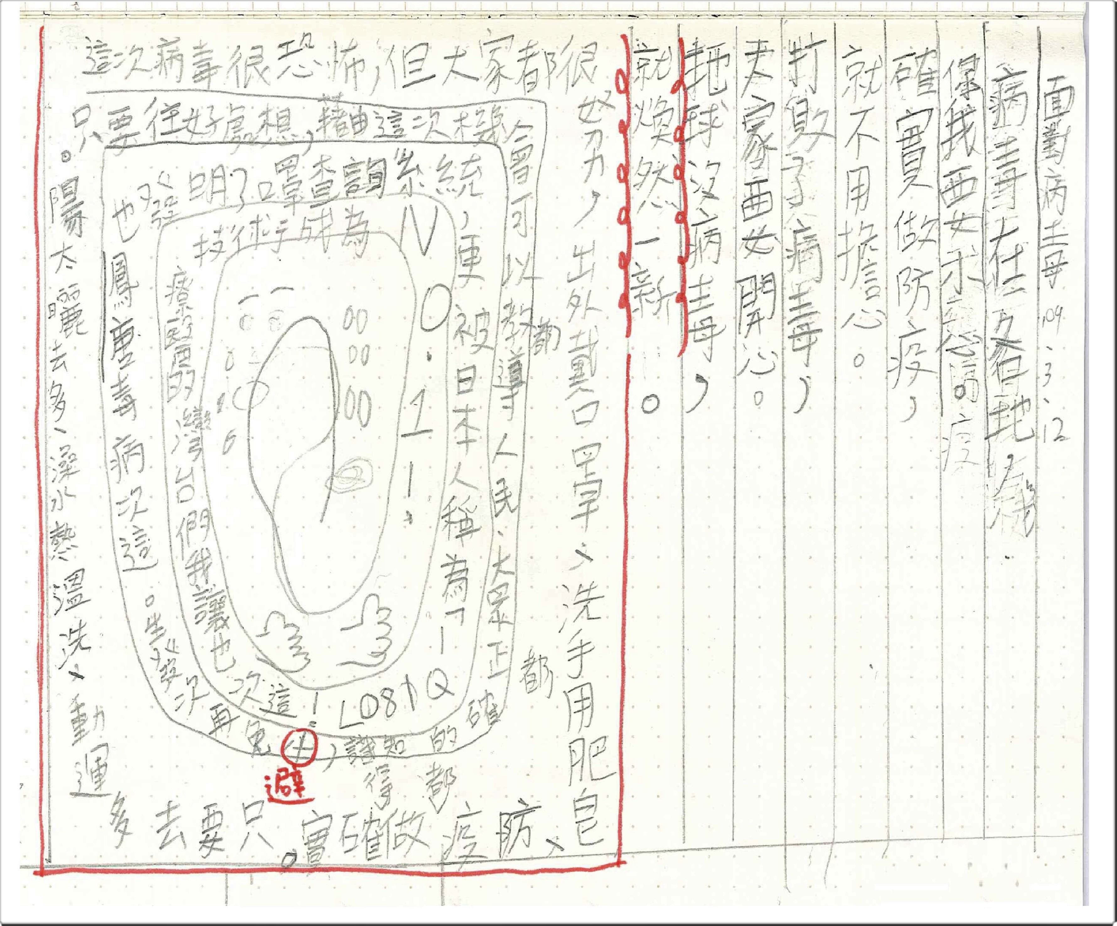 這次病毒很恐怖,但大家都很努力,出外都戴口罩、洗手都用肥皂、防疫都做得確實。只要去多運動、洗溫熱水澡、多去曬太陽。只要往好處想,藉由這次機會可以教導人民、大家正確的知識,避免再次發生。這次病毒,政務委員唐鳳也推動口罩查詢系統,更被日本人稱為「IQ180」!這次也讓我們台灣的醫療技術成為NO.1!