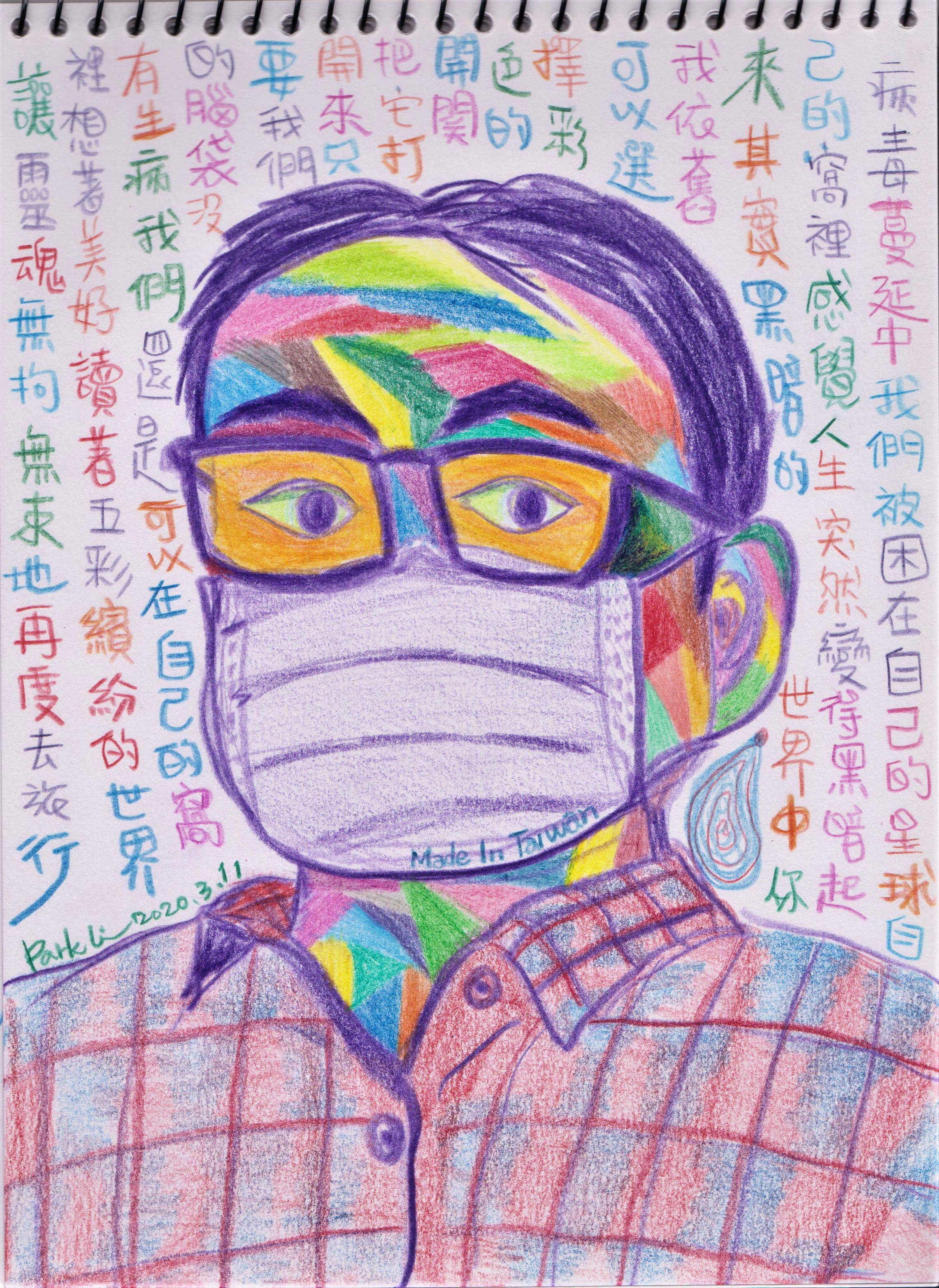 不久後,我打電話跟鄭老師致意。電話那頭,快90歲的鄭老師(1932年出生),像個孩子一樣,活力十足、淘淘不絕地跟我訴說,他跟孫子們創作的經過。他說,有一天晚上,他躺在床上睡不著,突然想到,可以來畫戴口罩的自畫像,因為這個有時代意義,可以凸顯出現在大家正面臨的困境。