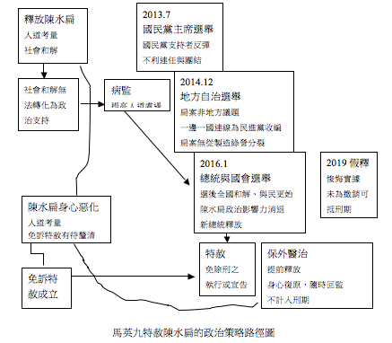 二零一六年的全國大選是陳水扁提前獲釋的最佳時機,因為民進黨一旦於總統勝選,選後即可給予陳水扁特赦,即便是國民黨勝選,追求選後全國和解、與民更始的新局,也必然會以釋放陳水扁作為條件,這時政治上的計算會高於人道的考量。至於是以特赦或保外醫治的名義,就要看陳水扁與國民黨新總統的默契,此因保外醫治期間不計入刑期,身心復原後仍須回監服刑,但如果陳水扁屆時政治魅力不再,甚至承諾退出政壇,國民黨的新總統就可以放心地給予特赦。