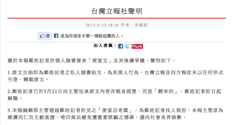 立報記者近日在臉書上為了沒有經過證實的便當文道歉並且請辭。連帶的轉發並且做更深入訪談的四方報編輯也出來道歉。或許我們感受到道德感被回復,台灣人還是很友善的,或許我們感到正義,因為一個假新聞被踢爆了。但是且慢,立報記者明明就是用自己的臉書寫了篇短網誌,四方報編輯也是用臉書轉發這個消息,這樣的行為到底與記者、編輯的身分有何干係?