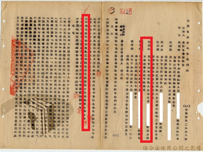 以台大經濟系學生為主的這個案子,不是「思想有問題」而已,而是所謂的「叛亂案件」,最後以「否決憲法,顛覆政府」的大帽子,扣上各種不同罪名判刑的,有七人:吳哲雄(台大政治系畢業,貨運公司業務主任)、歐振隆(台大畢業,鹿野鄉會計)、洪金盛(曾在台大肄業,當時無業)、吳崇慈(女,台大三年級)、涂炳榔(台灣師院四年級)、洪育樵(台大四年級)及吳逸民。