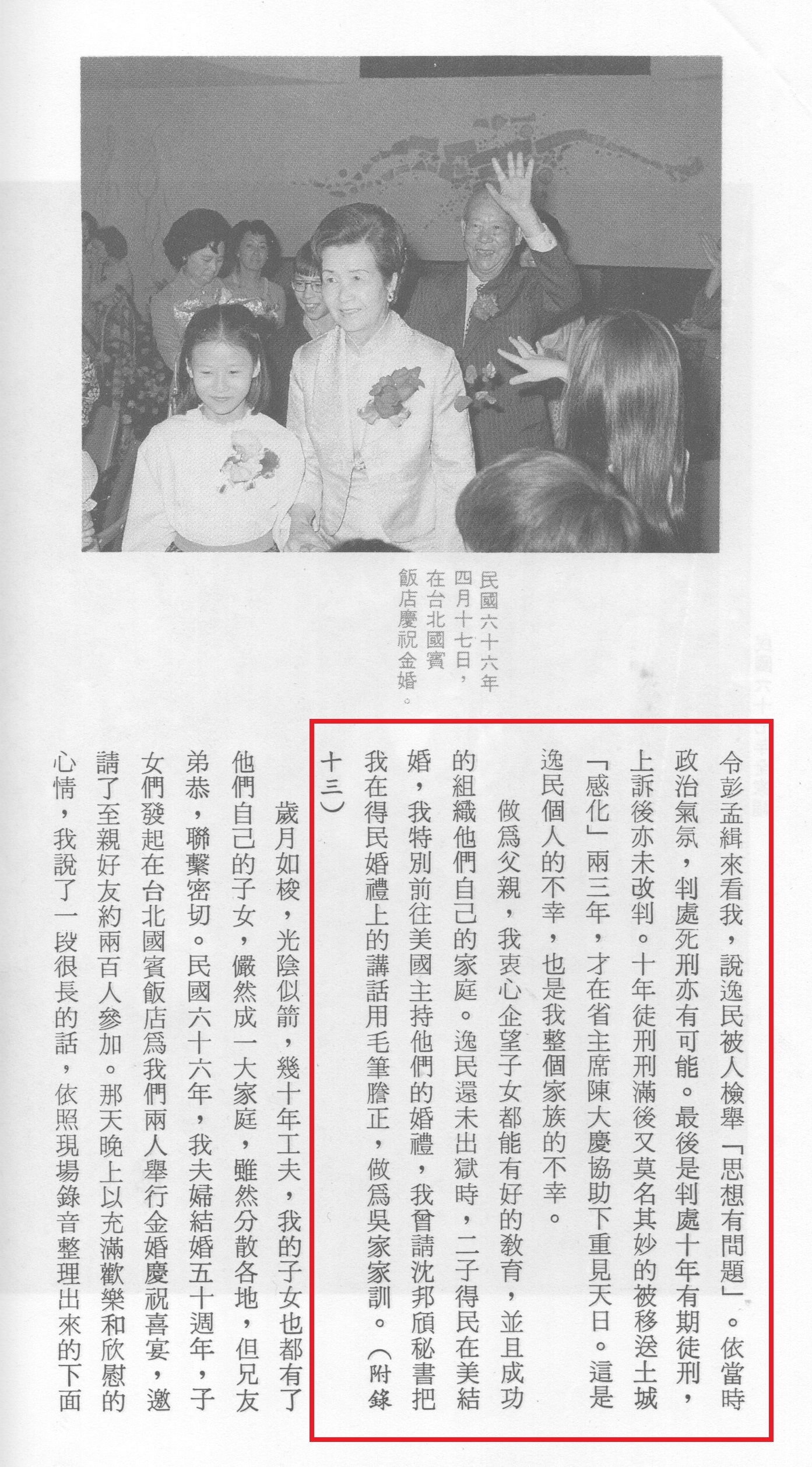 「關於監獄裡有組織一事,我一無所知,在監獄裡我很少跟人在一起,也很少人跟我講話,我喜歡在房間裡或在散步時完全是孤獨的,為什麼這樣,我也曾經想過,可是沒有理由可想,除了我的家庭環境太好,我的父親是台北市長,我的家庭是資產階級的家庭,這些理由外。在這樣孤獨的情形下,我怎能知道有組織。」