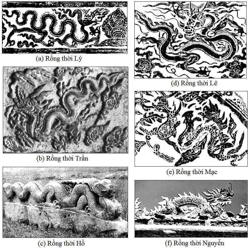 龍在不同時期的形象與特徵也不一樣。陳玉添指出,遠古雄王時代的龍仍很像其本體的鱷魚。李朝的龍(下圖a)則變成鱷魚和蛇的結合,身長彎曲,代表社會的平穩;長著濃密的毛髮,口含珍珠,代表豪華、高貴;龍的全身顯出柔軟、賢良的樣子。陳朝的龍(下圖b)輕輕鬆鬆地彎曲著,代表時代的活潑與發展。胡朝的龍(下圖c)外型胖胖的,代表充足、勇敢。黎朝的龍(下圖d)爪子彎折、樣子兇猛,從此可以辯識出越南社會已經走向一個完全嶄新的階段——中華文化深入最強、儒教成為國教的這個階段。莫朝的龍(下圖e)則隨意彎曲、糾纏,這正是混亂、分離、矛盾不斷的時代的樣貌。阮朝的龍(下圖f)恢復兇猛的外型,它代表儒教再度恢復成為越南國教地位。