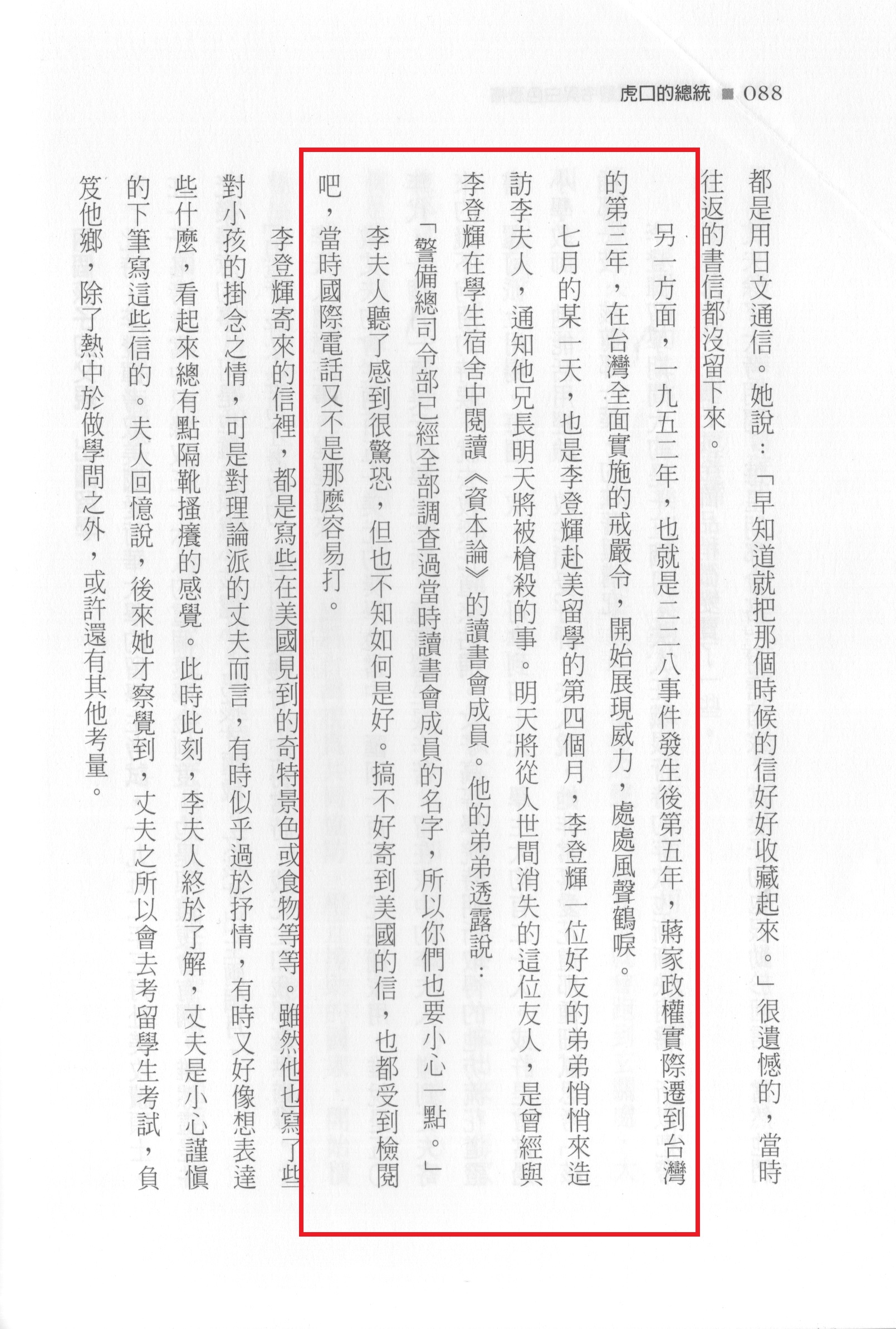 這位人士向李夫人透露:「警備總司令部已經全部調査過當時讀書會成員的名字,所以你們也要小心一點。」該書記述:「李夫人聽了感到很驚恐,但也不知如何是好」。