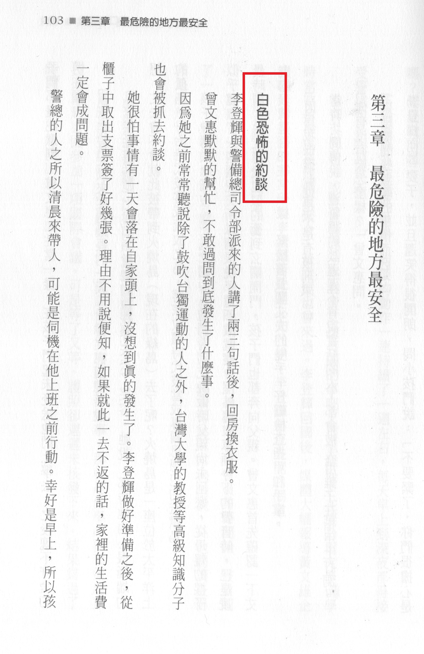 然而,李登輝一九六五年再度赴美留學修博士學位後,又讓他陷入白色恐怖的陰影。出國前一年,跟他有私交的彭明敏因《台灣人民自救宣言》案被捕;留美期間,李登輝住處經常接待台灣留學生,其中包括一九七○年在紐約暗殺蔣經國的黃文雄,是否還有其他的台獨人士不得而知。