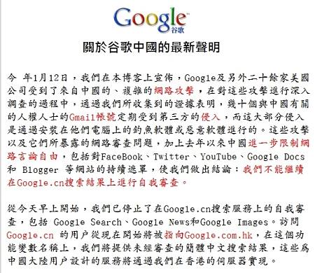 2010年3月23日 Google於部落格中發表「關於谷歌中國的最新聲明」表示不繼續在Google.cn搜尋結果上進行自我審查,同時將Google中國的網頁搜尋、圖片搜尋和資訊(新聞)自動定向至Google香港。