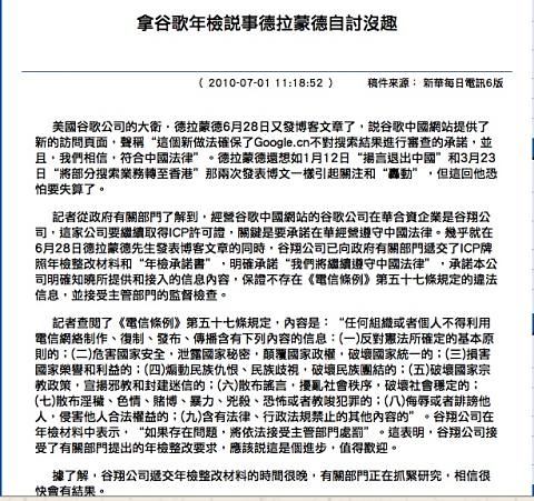 報導批評「美國谷歌公司的大衛‧德拉蒙德6月28日又發博客文章了,說谷歌中國網站提供了新的訪問頁面,聲稱『這個新做法確保了Google.cn不對搜索結果進行審查的承諾,並且,我們相信,符合中國法律』」,「這家公司要繼續取得ICP許可證,關鍵是要承諾在華經營遵守中國法律。幾乎就在6月28日德拉蒙德先生發表博客文章的同時,谷翔公司已向政府有關部門遞交了ICP牌照年檢整改材料和『年檢承諾書』,明確承諾『我們將繼續遵守中國法律』,承諾本公司明確知曉所提供和接入的信息內容,保證不存在《電信條例》第五十七條規定的違法信息,並接受主管部門的監督檢查」,「谷翔公司在年檢材料中表示,『如果存在問題,將依法接受主管部門處罰』。這表明,谷翔公司接受了有關部門提出的年檢整改要求,應該說這是個進步,值得歡迎。」