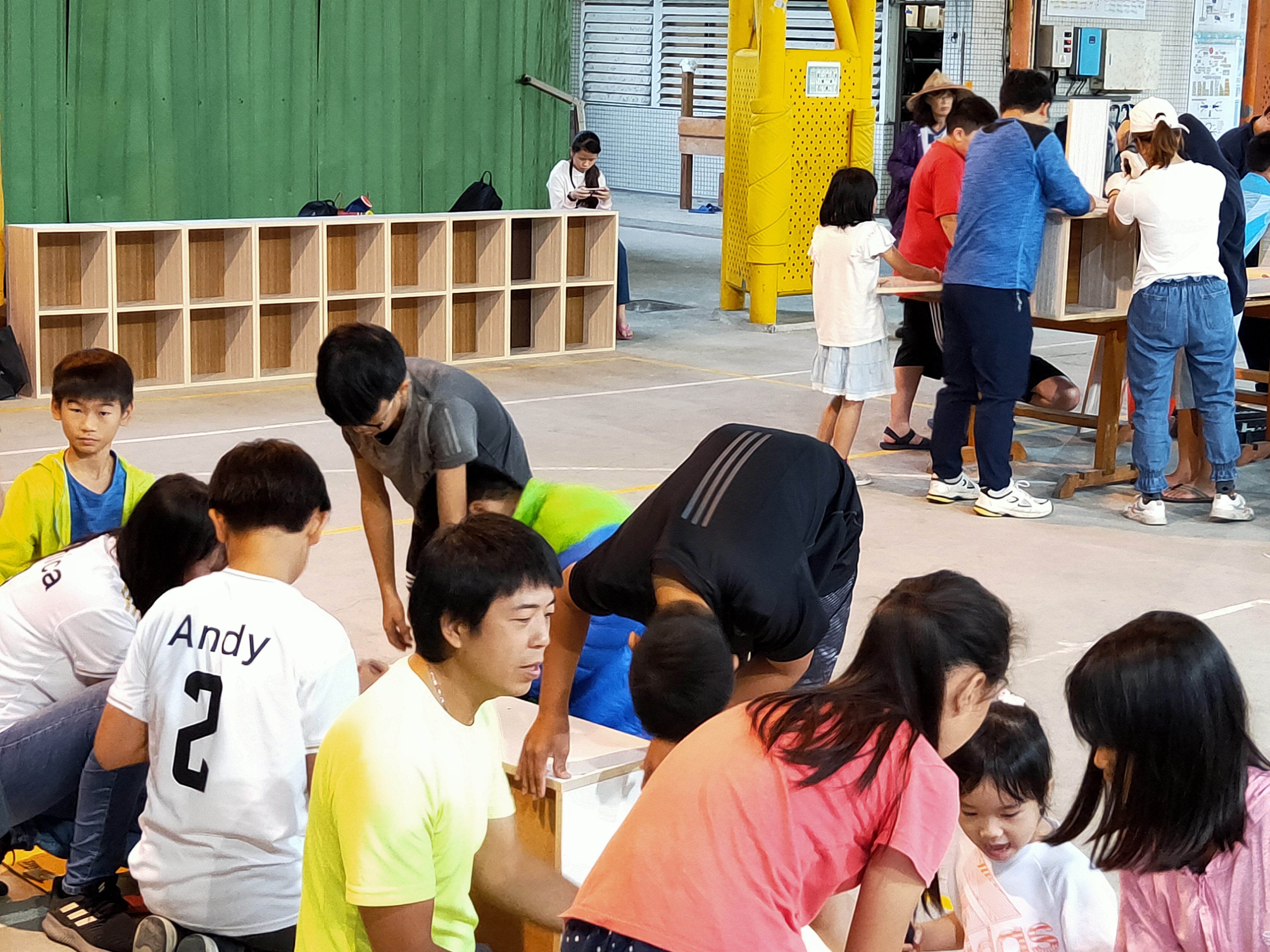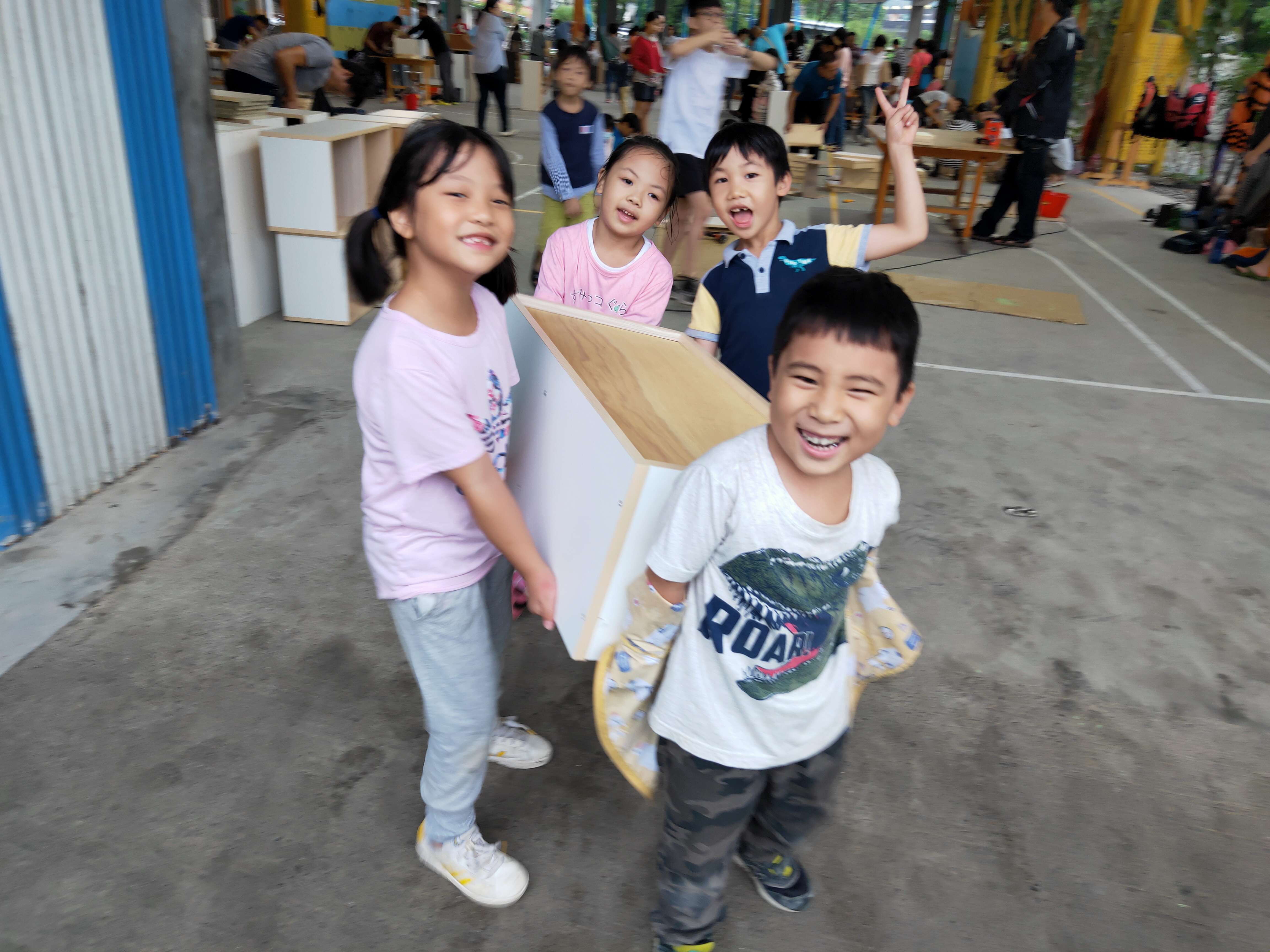 在王先生示範完組裝細節,主任說明各班組裝的定點空間,大人小孩紛紛動起來。各班小螞蟻大螞蟻飛快地到材料區域,一塊、兩塊、三塊…一疊木料慢慢移動到班級定點;一次、兩次、三次…好多次專注且注重安全,緩慢地移動回班級,低年級小孩明顯需要大人陪同協助,但小小孩們包含幼兒園的弟弟妹妹都一起加入,都覺得工作得很開心。