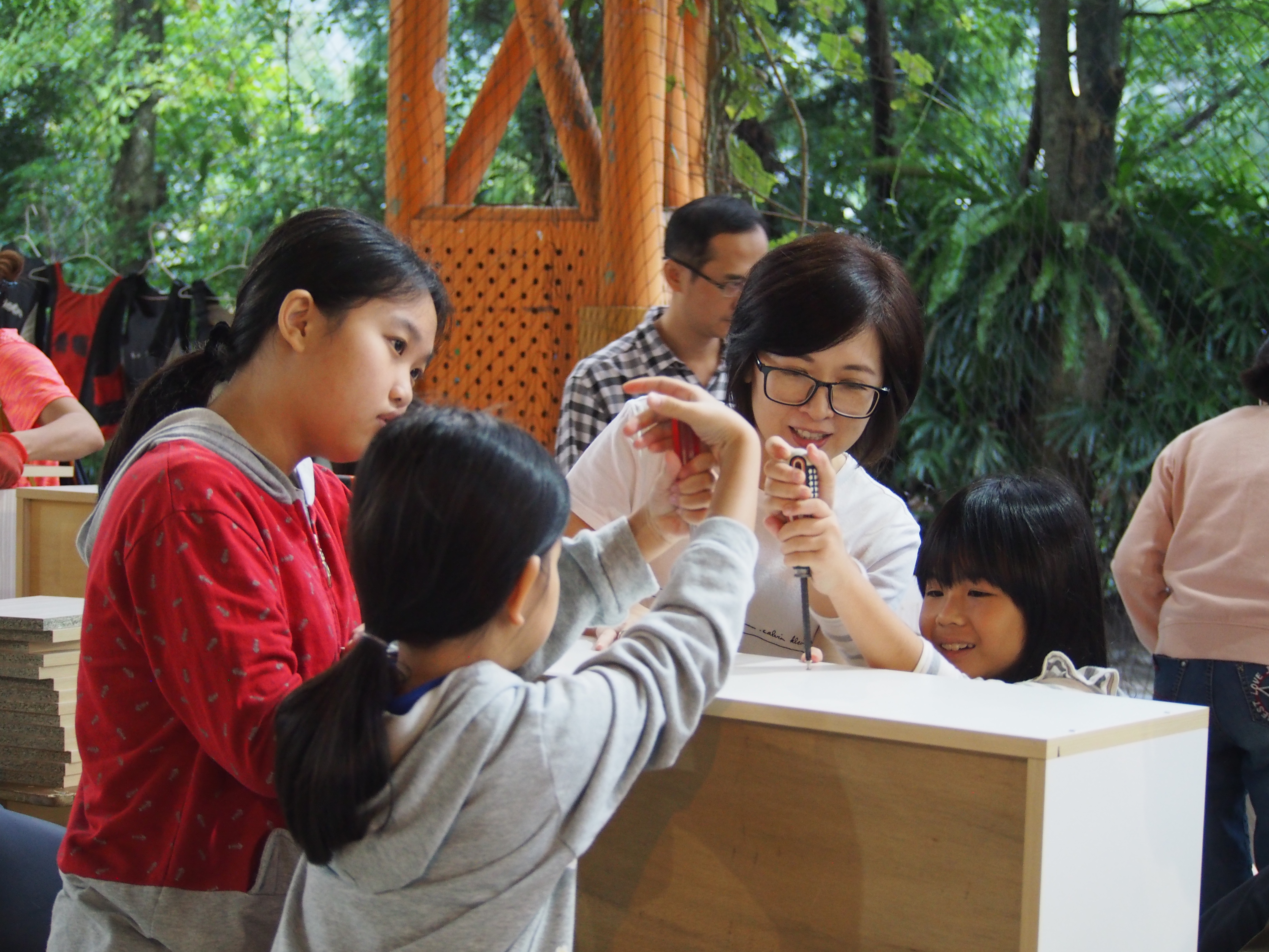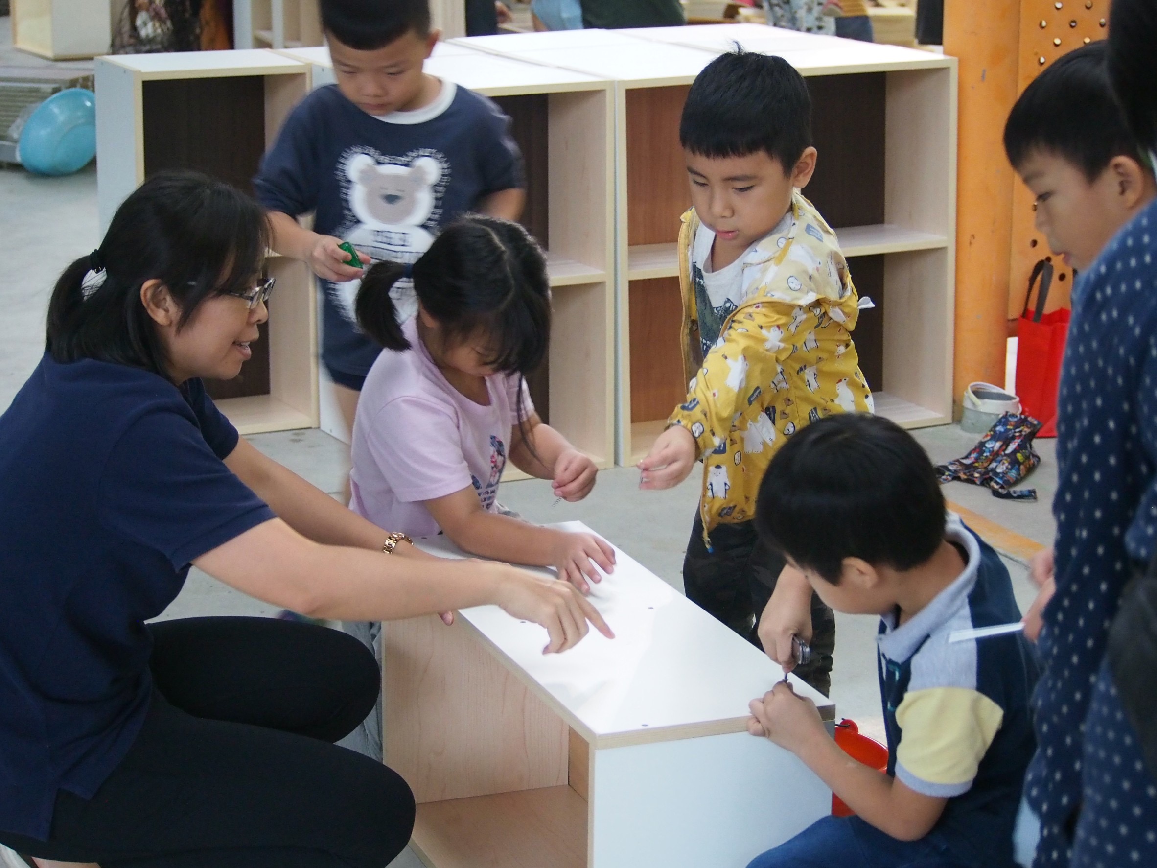 高年級的哥哥姊姊,也陪著老師才幼兒園的孩子嘗試十字起子旋轉螺絲固定櫃板。