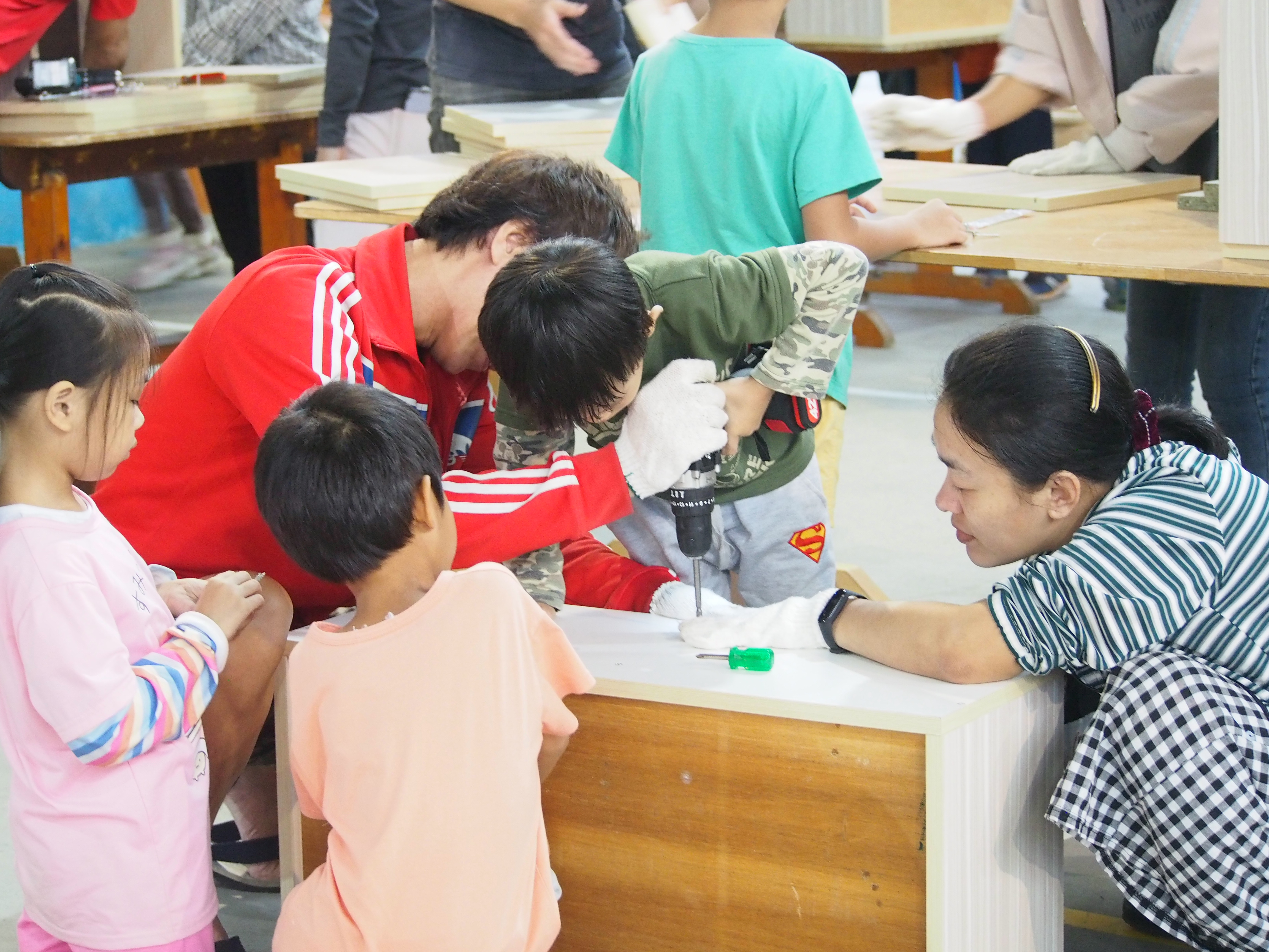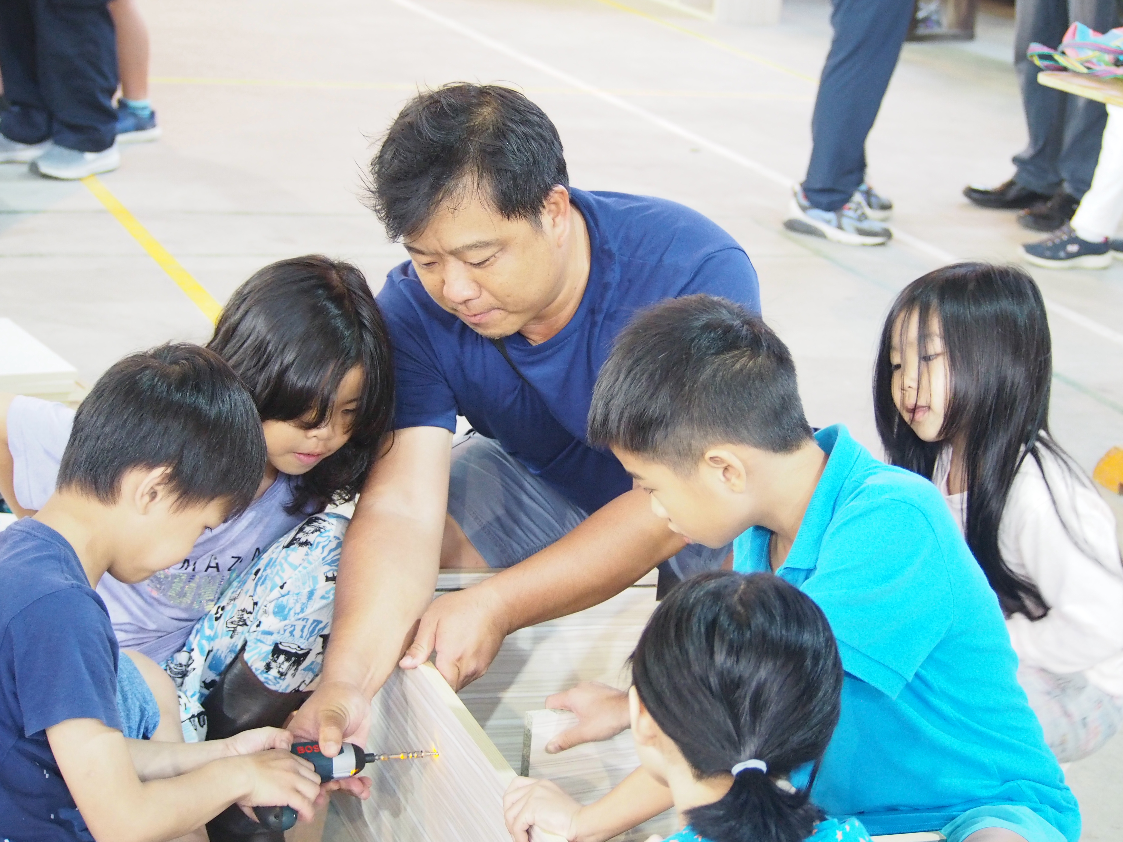 家長、老師們開始按照施工步驟拼裝,中低年級的孩子們對電動起子感覺好奇,帶著電動起子的家長不分你家我家只要有小孩好奇,就讓孩子嘗試使用電動起子,不厭其煩一次一次說明,電動開關位置、起子如何對準、注意安全…。